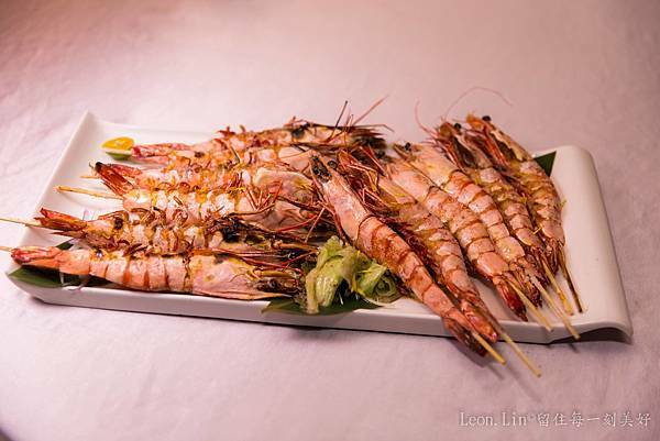 有了山珍,那當然緊接著就會有海味啦~鹽烤大蝦,十幾公分長的深海大草蝦烤得噴香~蝦肉真的超Q彈而且又帶著濃厚的甜味。