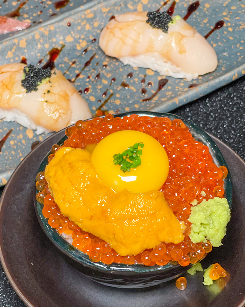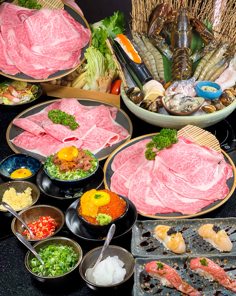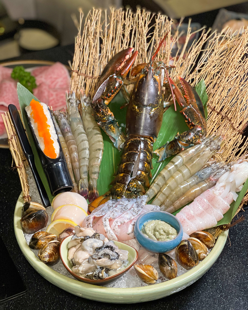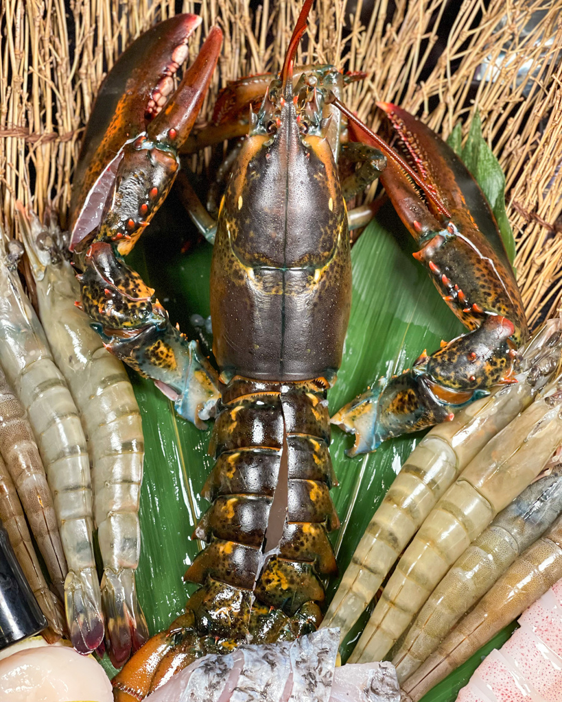 內含:活鮑魚、草蝦、扇貝、鮮蚵、蛤蠣、花枝漿、鱸魚片、義式油醋沙拉、干貝握壽司、菜盤、甜點、水果、煮粥