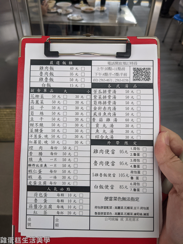 ▲菜單:除了雞肉飯魯肉飯飯類,還有許多小菜和湯品,其中荷包蛋魯蛋、蒜醬冷豆腐為招牌必點(我們都沒點到...)。