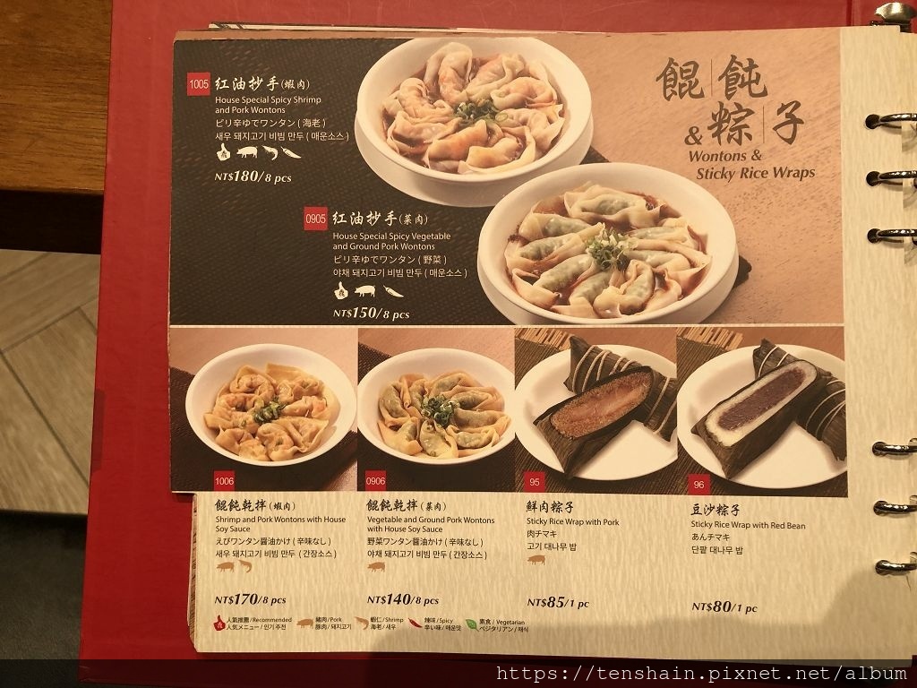 紅油抄手也是鼎泰豐的名菜,可以試試。為什麼「紅油抄手」放在「餛飩&粽子」這一頁?因為四川話稱餛飩為抄手,將鮮肉餛飩煮熟後,盛入以辣油為主的醬料中,就叫紅油抄手。