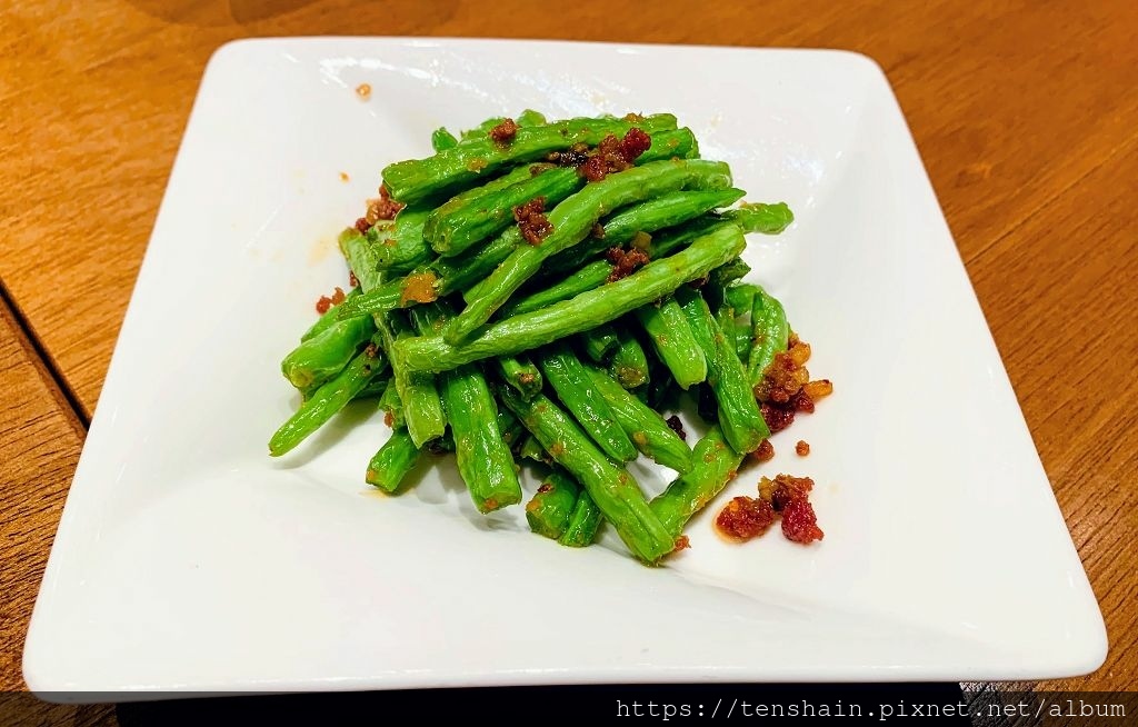 乾煸四季豆 ( NT$150 ) 是一道冷菜,四季豆「去絲」的動作做得極徹底,不留一絲礙口的粗纖維。去絲洗淨後下鍋,以蝦米與辣椒肉末拌炒而成。鼎泰豐的乾煸四季豆,和尋常見到的不同,保留更多四季豆原本的脆度和鮮綠的顏色,在「色」的呈現上更勝一籌,能同時能嚐到四季豆的鮮甜與乾煸香氣,滋味爽脆鹹香。不過,如果你吃慣重油重鹹的乾煸四季豆,可能會覺得口味稍淡。