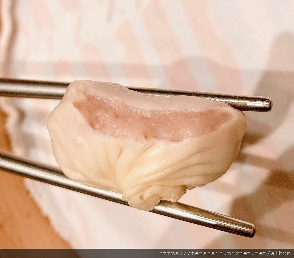 芋泥小籠包 ( 5 個NT$95/ 10 個NT$190 ) 是我們今天中餐的結尾甜點,一樣是黃金18 摺的細緻外皮,薄得可以透視裡面的內餡。