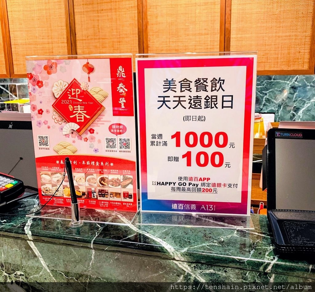 結帳時才發現遠東百貨公司 A13 現在有「美食餐飲 天天遠銀日的活動」,只要當週使用遠東百貨 APP ,以 HAPPY GO PAY 綁定遠銀卡支付餐費,累計滿 1000 元,就贈送 100 元電子抵用券。
