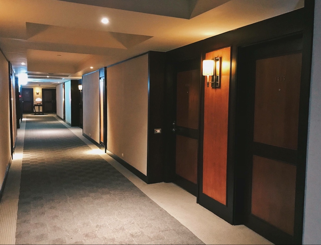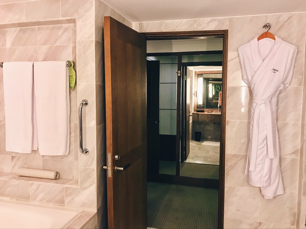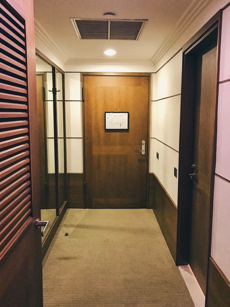 與大部分的飯店格局一樣,晶華的豪華客房入口處是一道走廊,右手邊是廁所衛浴的部分。