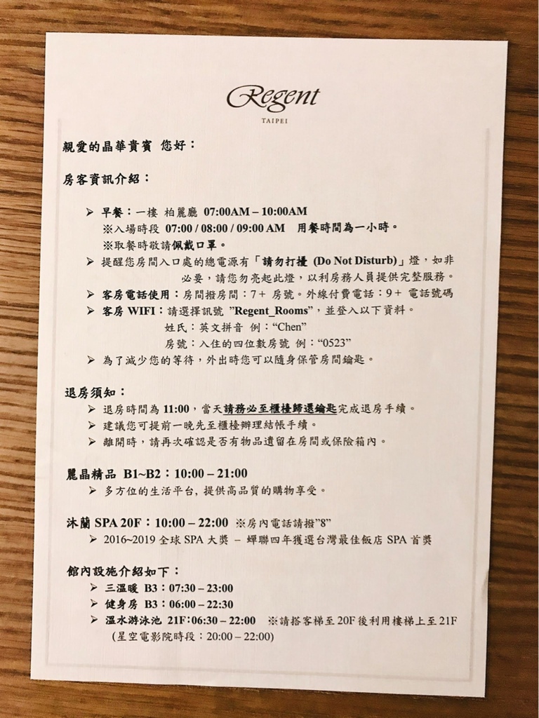 房卡夾上和剛剛服務人員給的單子上都註明了館內各項設施的樓層與開放時間,另外房內也有提供免費wifi可使用。