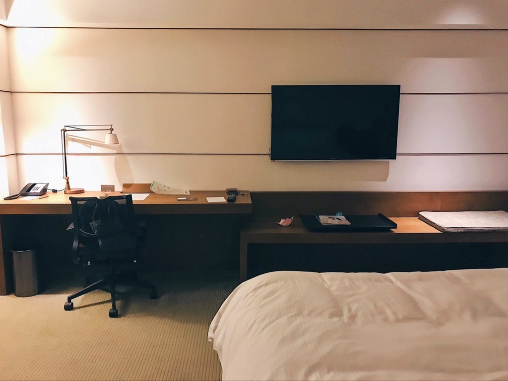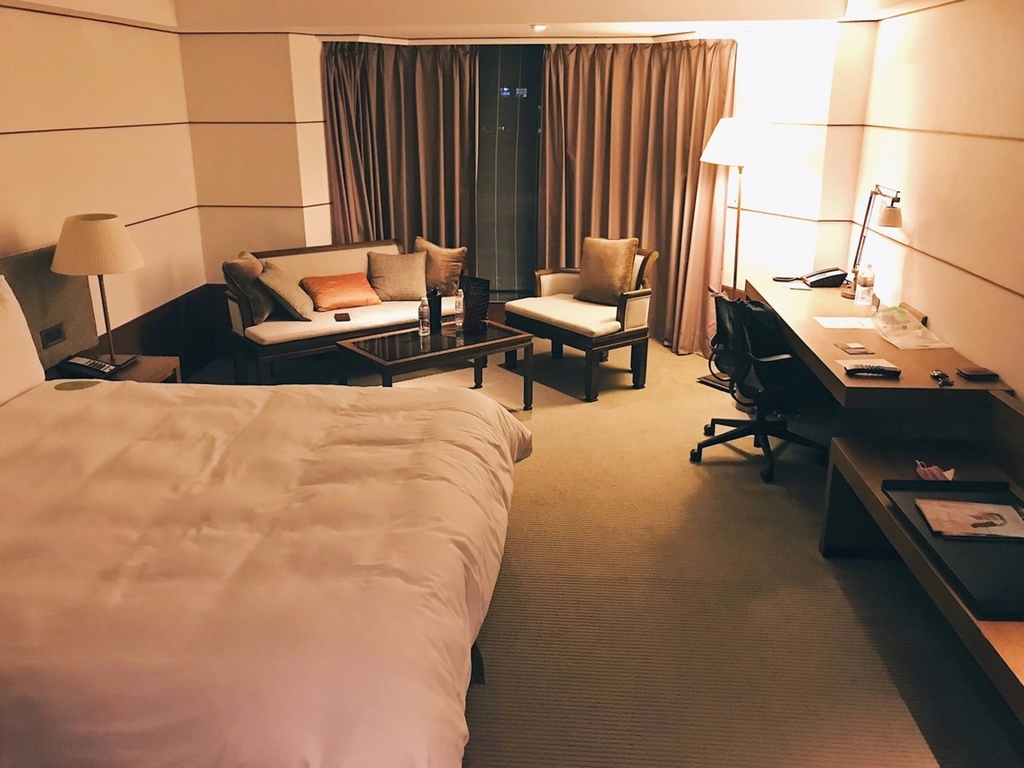 豪華客房有13坪大,兩個人住起來已經覺得十分寬敞,尤其又是在中山區這個地理位置超棒的鬧區,窗簾打開就能欣賞的台北市中心的景色。