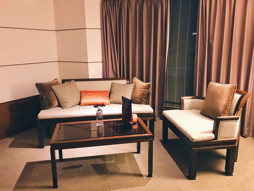 雙人床旁邊是沙發區,很適合坐在這兒吃吃喝喝,如果把後面的落地六角窗的簾幕拉開,繁華的城市景觀再配上一瓶紅酒那就真的太享受了~