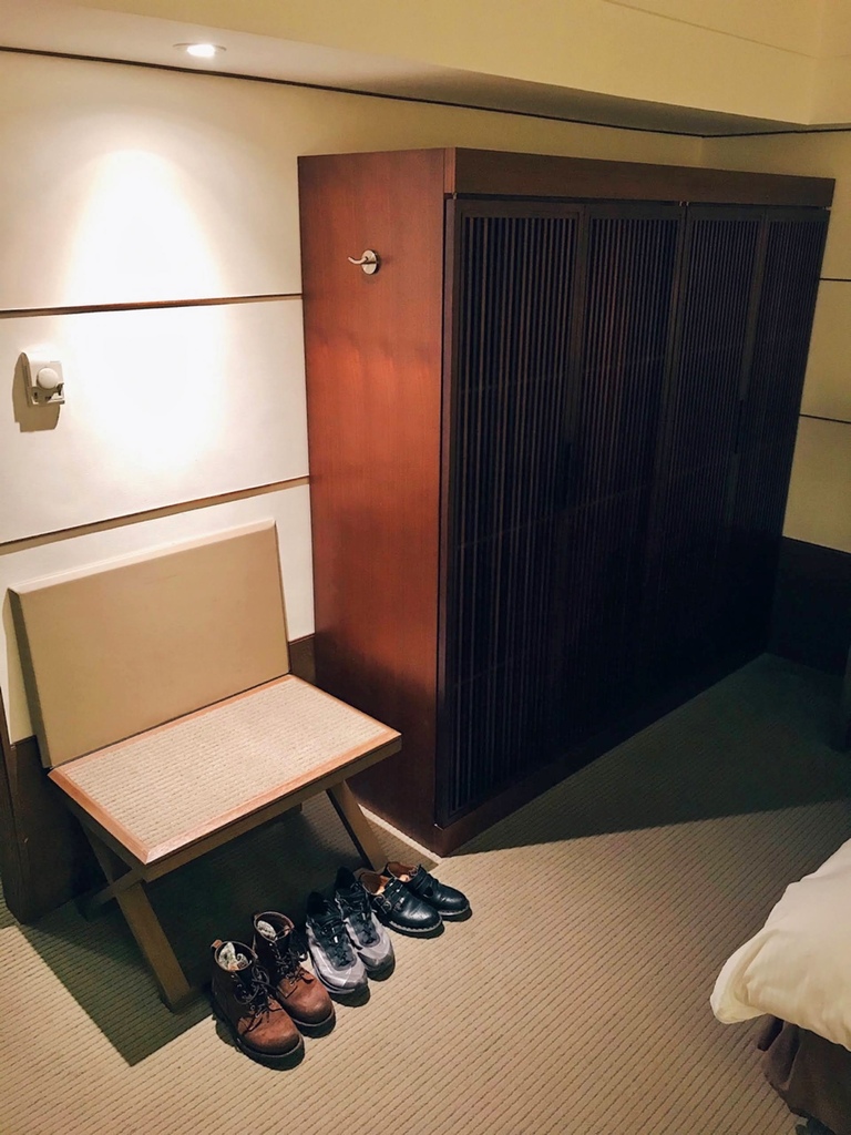 床鋪的右手邊是個超大的木質衣櫃,旁邊還有個小平台可以放行裡或當穿鞋椅來坐。