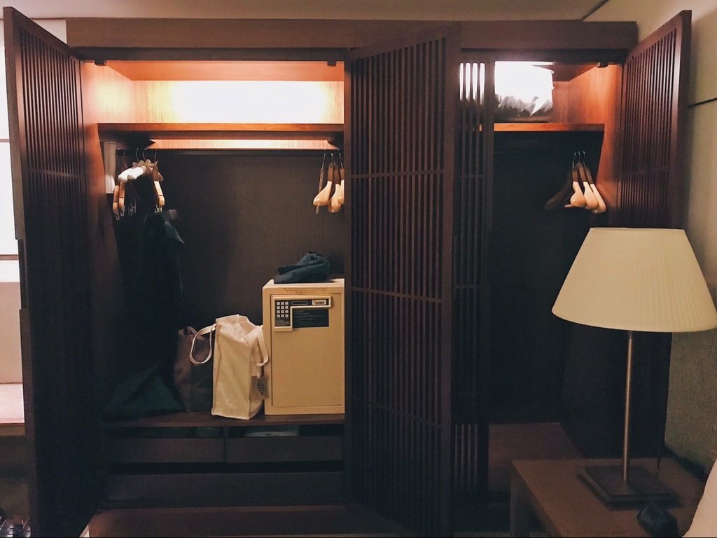 衣櫃內左半邊提供了各式衣架,還有一個保險箱,下方的抽屜則有室內拖鞋和洗衣袋等等;右半邊則有多提供一床棉被。