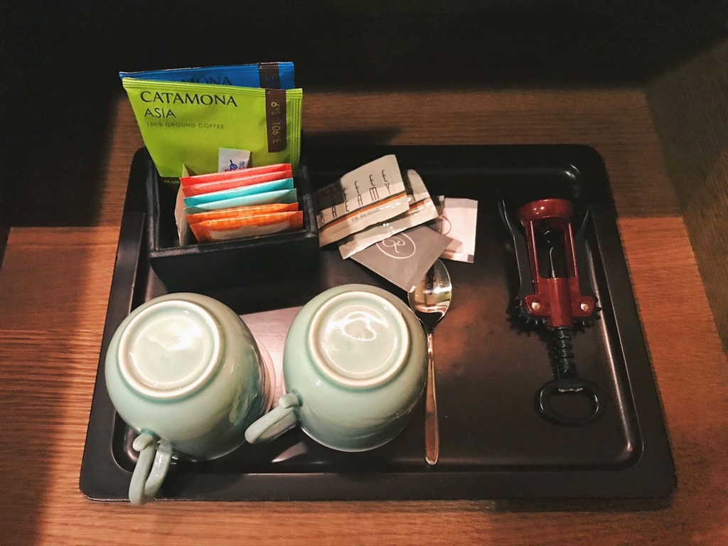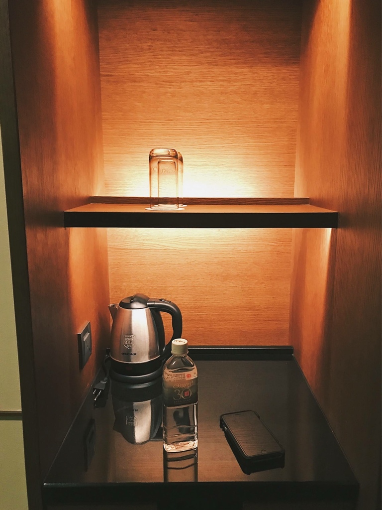 Mini Bar的部分位於入口處的走道旁,上方有玻璃杯、礦泉水和熱水壺。
