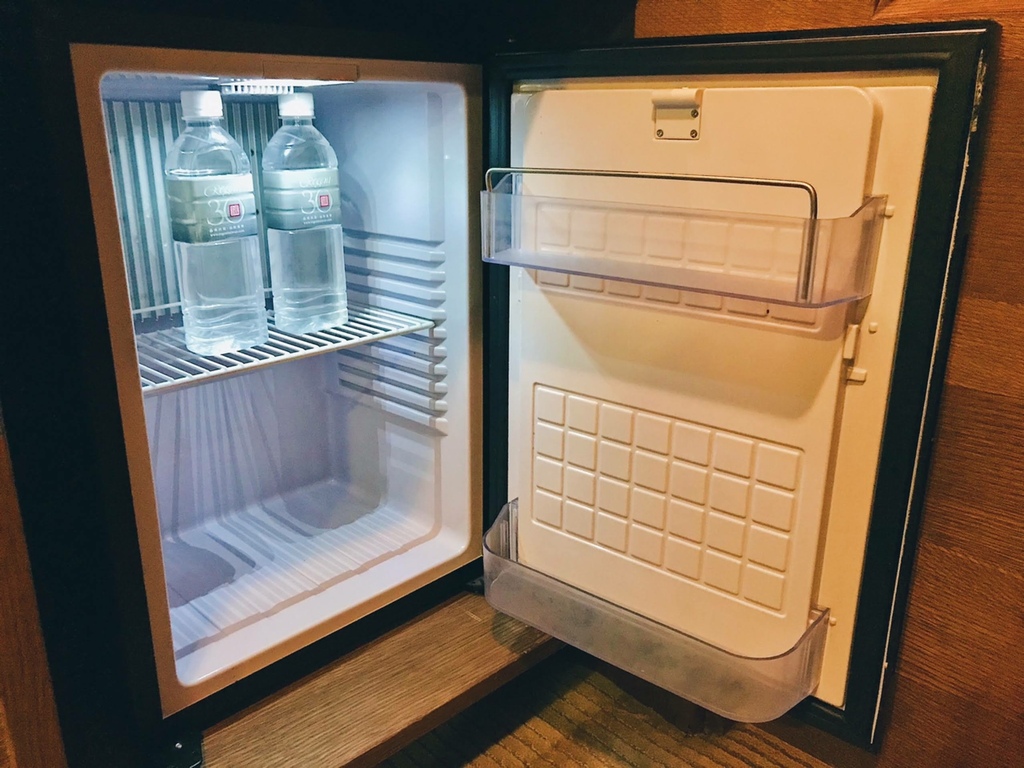 拉開下面的抽屜擺放了茶杯、湯匙、開瓶器,以及各式茶包、咖啡;最下面的小冰箱什麼東西都沒有,只有兩瓶礦泉水哈。