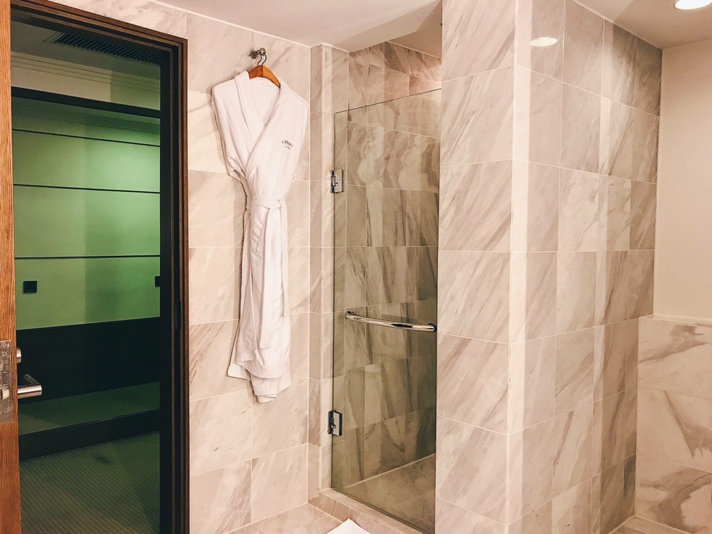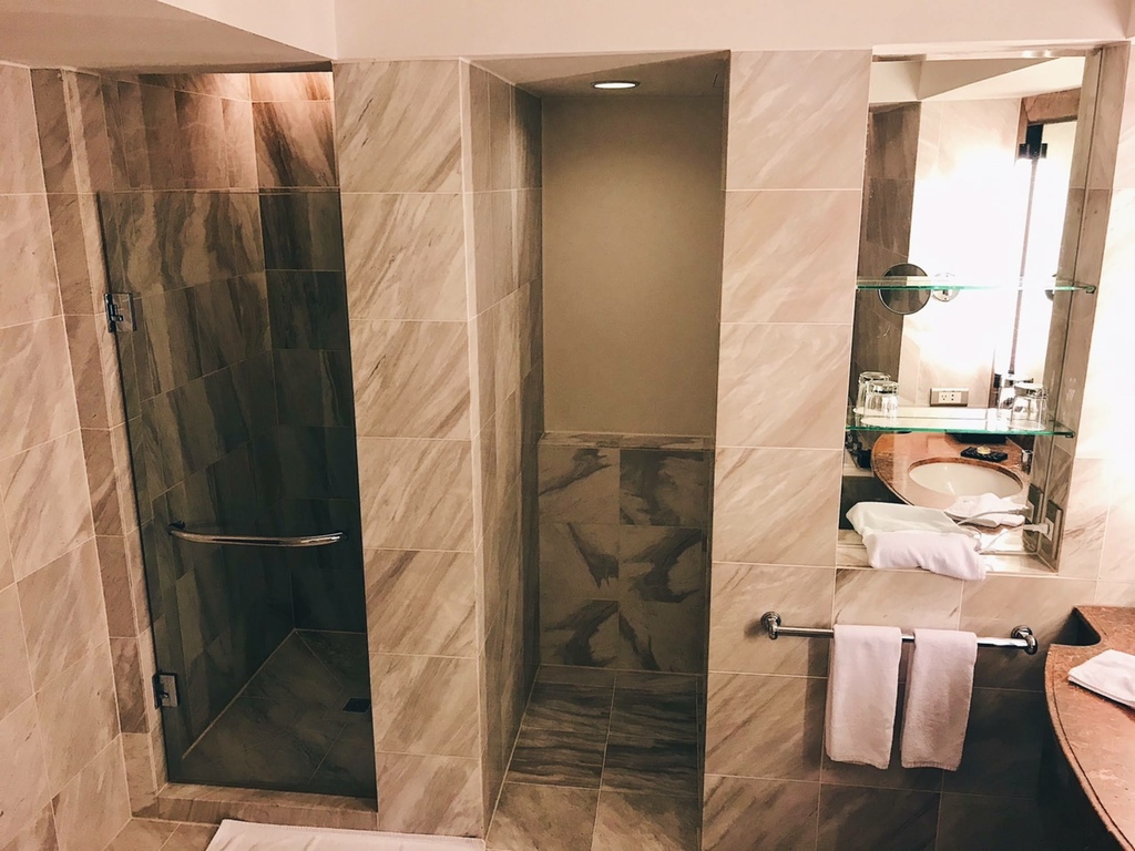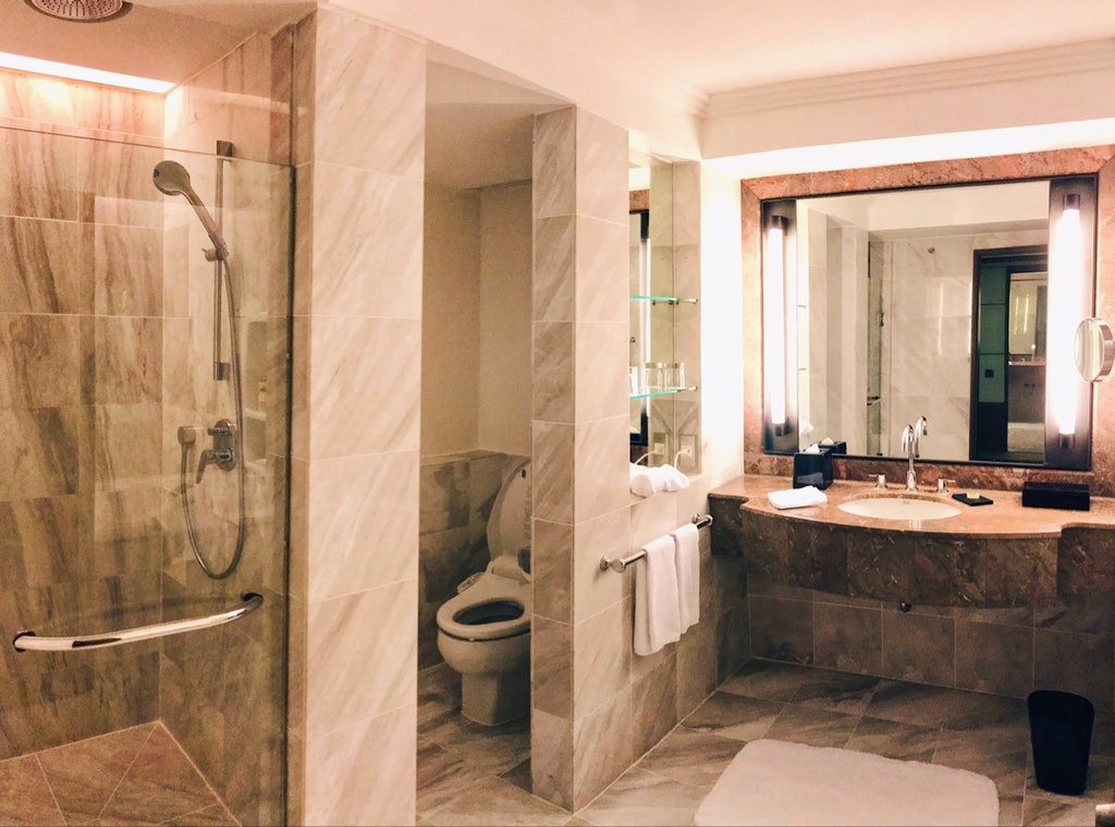內部空間主要是以大理石為主,給人一種很大氣豪華的感受,入口處是淋浴間,旁邊隔間則是免治馬桶。