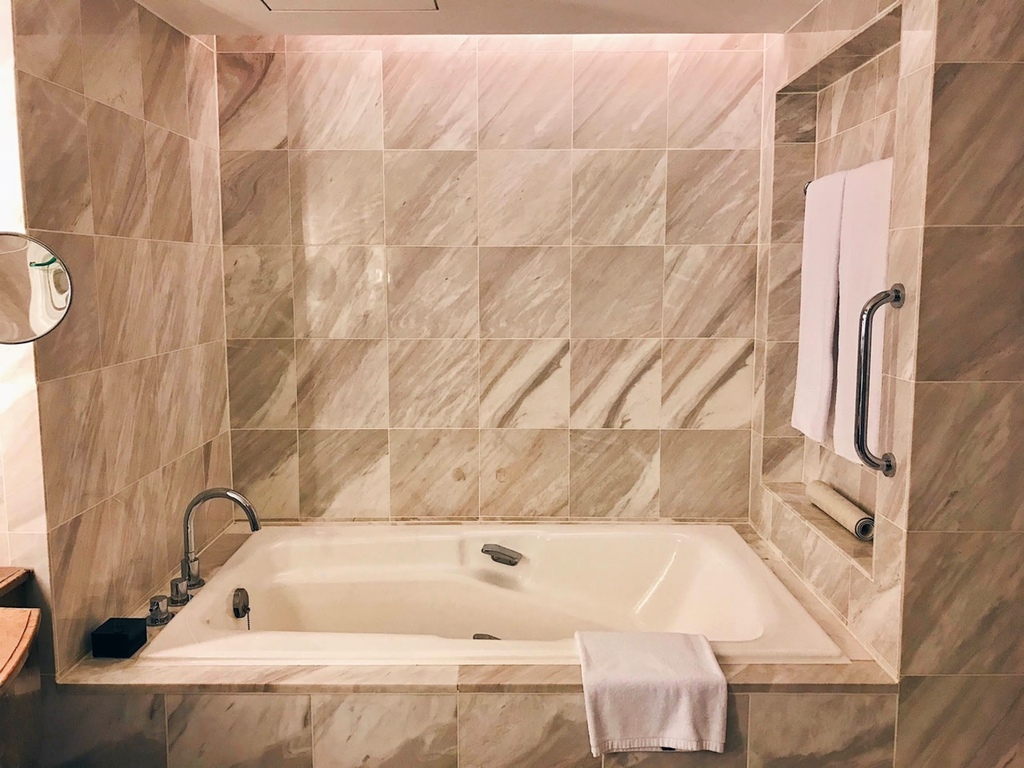 洗手台右側是一個深浸式浴缸,還提供沐浴鹽讓你去角質,後方則放置了大浴巾和防滑墊。
