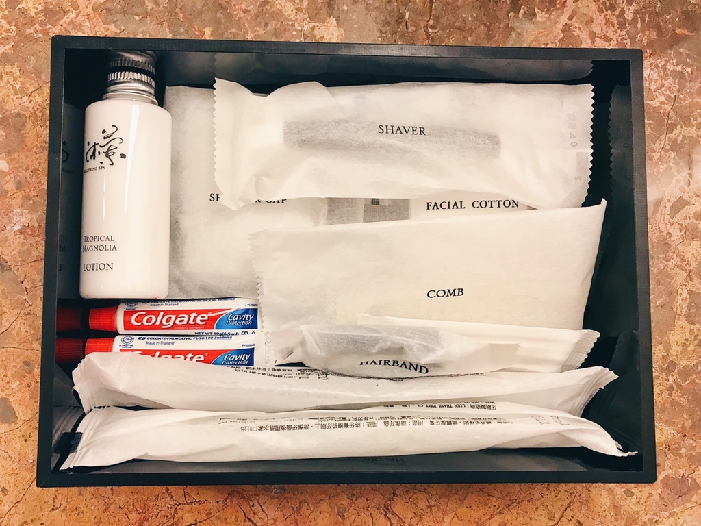 洗手台的部分除了有肥皂外,旁邊的盒子裡提供了各種盥洗用具,如:牙膏、牙刷、刮鬍刀、卸妝棉、浴帽、梳子等等。
