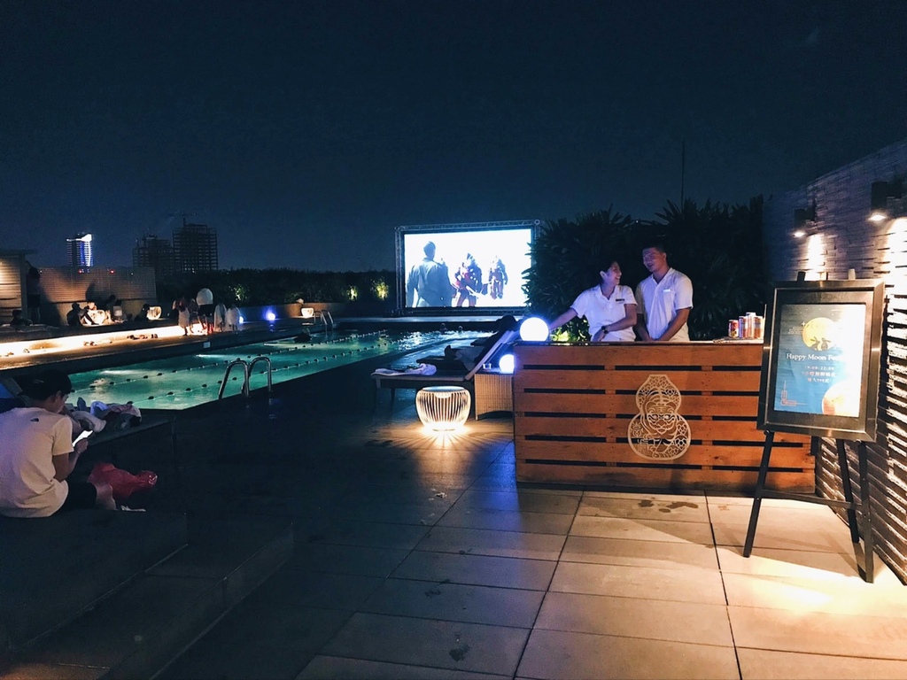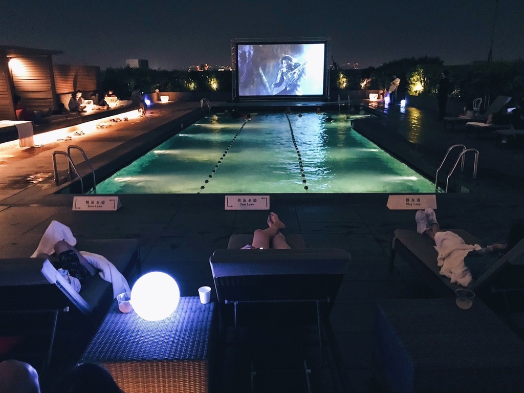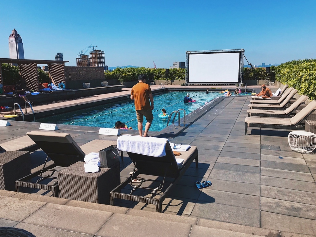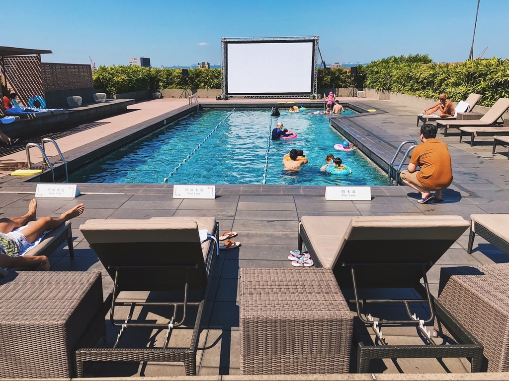 使用完健身房後我們繼續搭電梯到21樓去頂樓的溫水游泳池,因為周末晚上會有星空電影院,