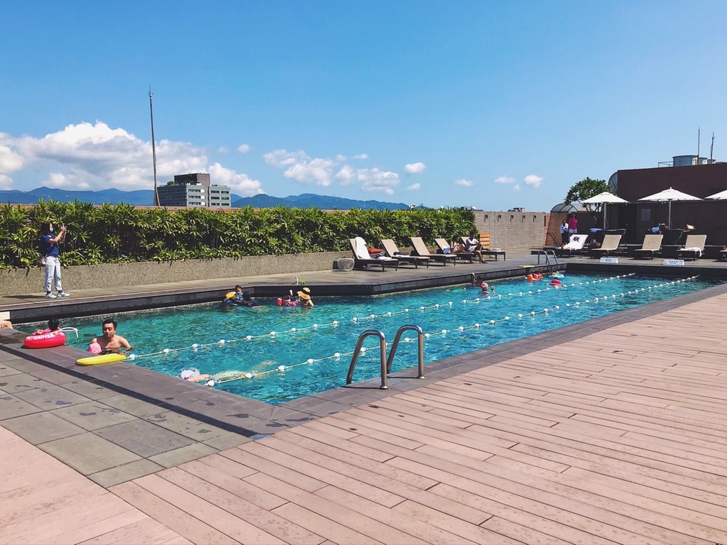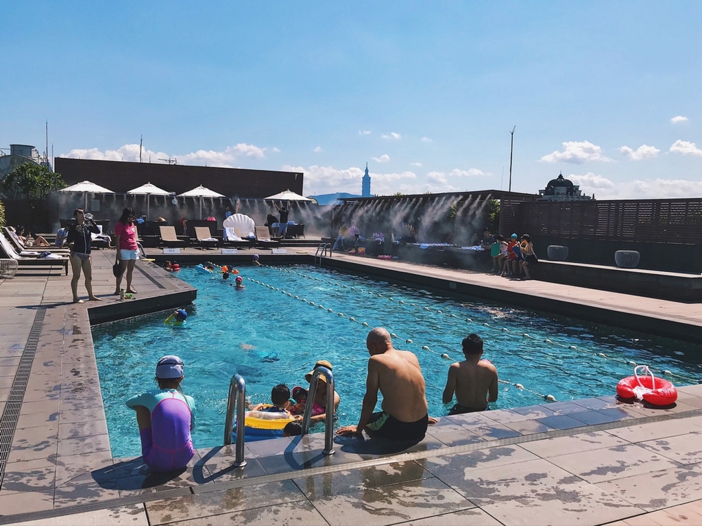 晶華的溫水游泳池並不算大,開放時間是06:30-22:00,秋日的白天陽光普照甚至還有點熱,旁邊的發呆亭還開啟了灑水裝置降降溫。