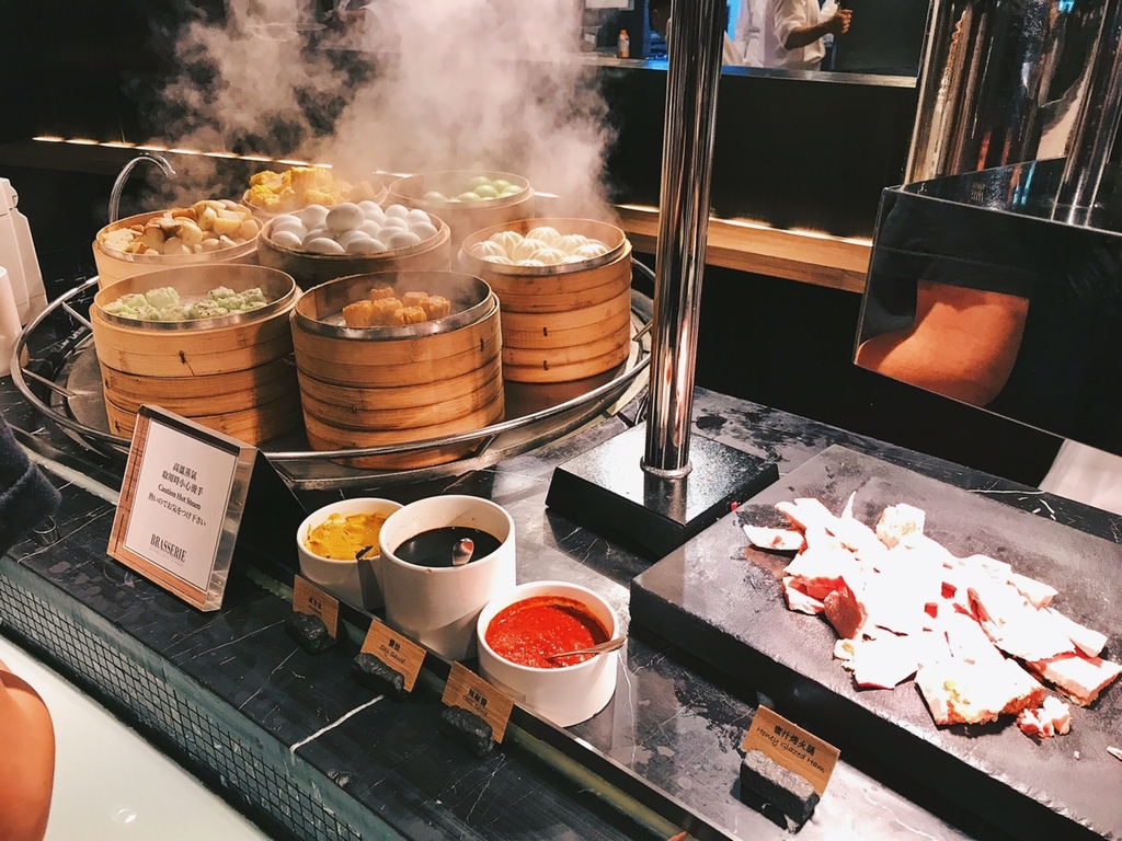 中式的部分光是蒸籠裡的菜色就讓人垂涎欲滴,有各種包類、特色燒賣等等,另外還有現煎蔥油餅和荷包蛋。
