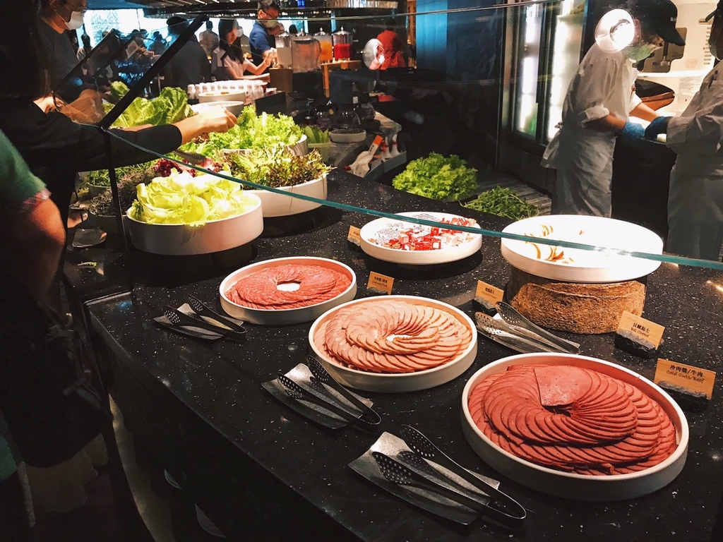飲料的部分選項也不少,旁邊則是沙拉區和一些冷盤的牛肉、火腿、起司等等。