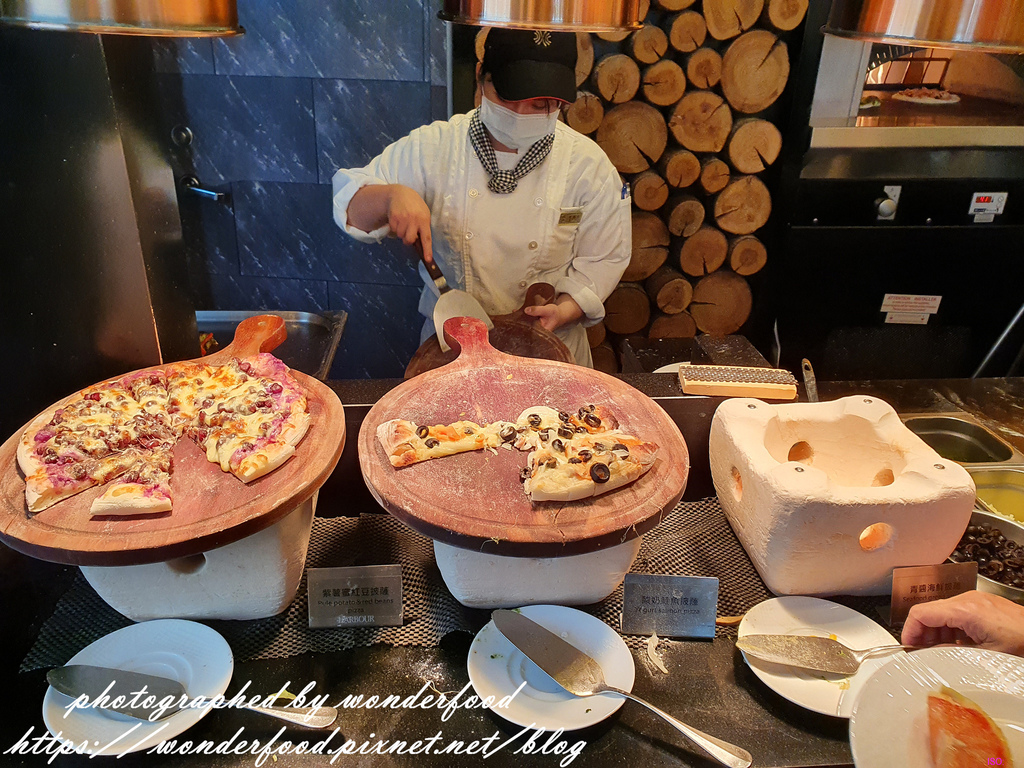 青醬海鮮披薩 、紫薯蜜紅豆披薩、酸奶鮭魚披薩 、白蘭地焦糖葡萄柚