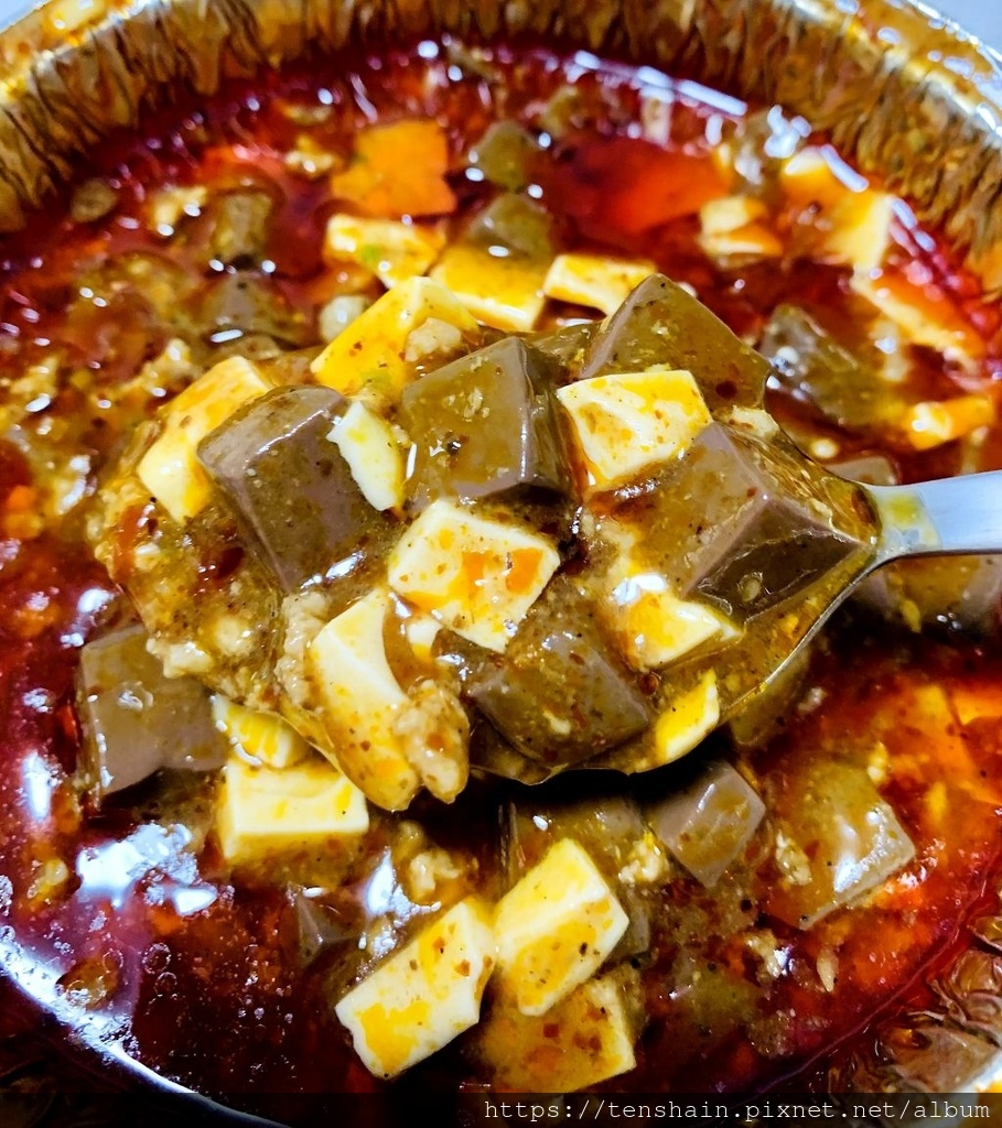 咦?!我到底看到什麼了?印象中超級麻婆豆腐飯是小辣,所以我才點的,可是一撕開鋁箔紙顏色,看那紅通通的辣油,我就知道慘了!這哪是小辣?根本是超級辣!辣死人不償命,難怪叫"超級 "麻婆豆腐!嫩白豆腐搭配嫩 Q 鴨血,這種組合可是我第一次看到。黑白雙色的組合,展現與眾不同的創意。不管是豆腐或鴨血,都切成小立方體,展現師傅的精湛刀工。這道菜超適合是配飯,雖然蠻辣的,但是真的很好吃,份量又夠多。老婆開玩笑說,如果直接點這道,再加點 3 碗白飯,一家四口的一餐就解決了,不但真香!而且真省!哈哈~