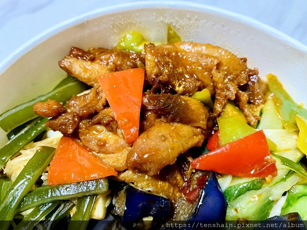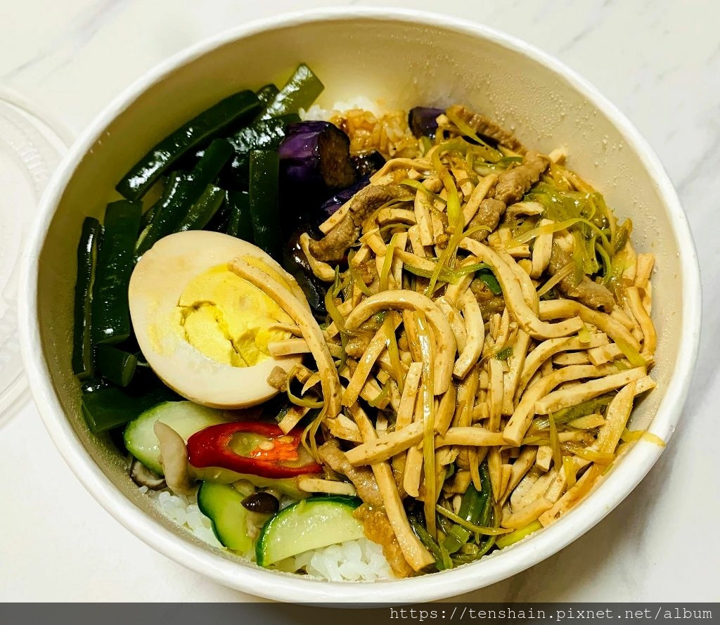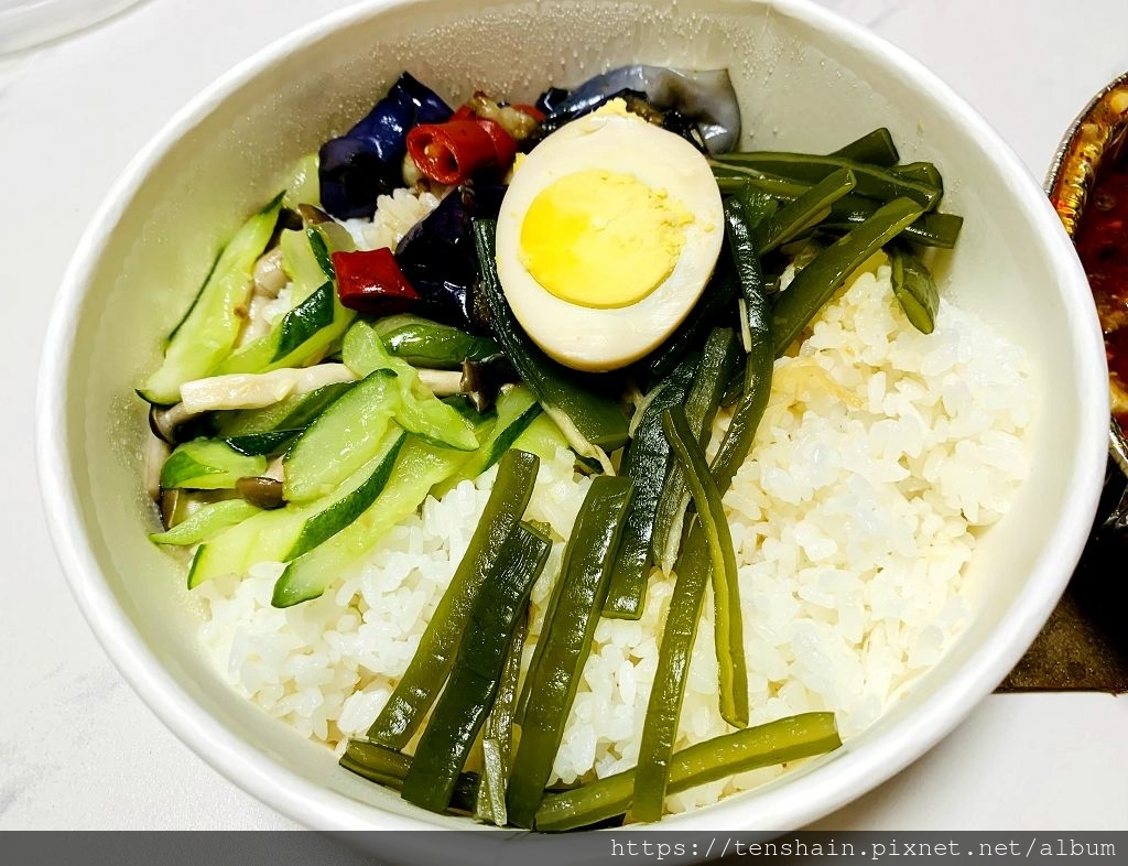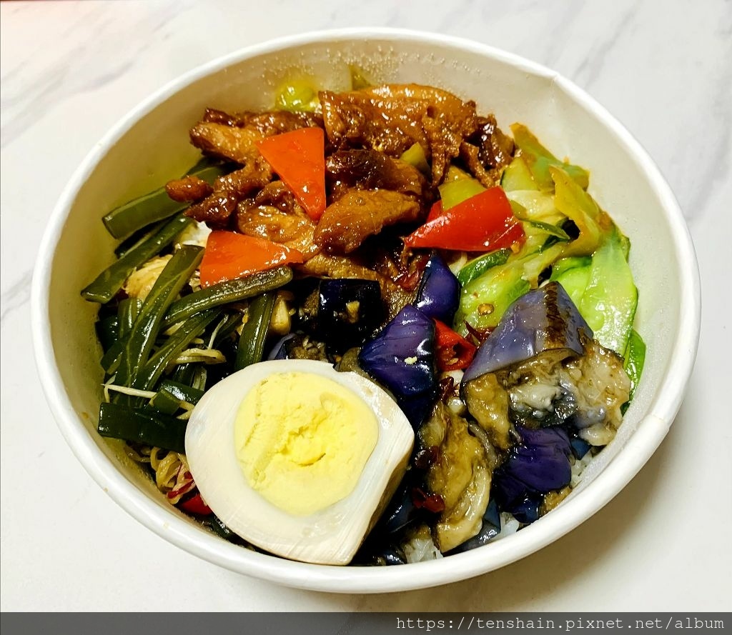 糖醋雞丁飯,除了主菜糖醋雞丁外,配菜有半顆比水煮蛋有味道,比滷蛋沒有味道的蛋,還有海帶芽,胡瓜、茄子、彩椒。厚實的海帶芽,個人不愛,因為不習慣那淡淡的腥味。胡瓜炒得很軟,茄子炒得不會太爛,油香鹹軟,好吃。