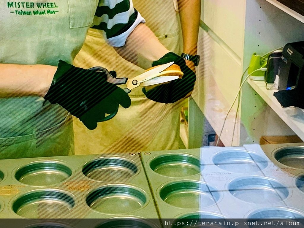 車輪餅全熟後,還得經過修邊的動作,讓整個車輪餅更美觀。