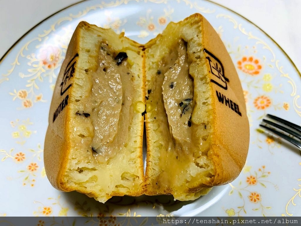 芋見大甲口味,嚴選大甲芋頭磨成漿,中間夾雜一些較大的芋粒。漿狀的芋頭餡,散發出濃郁的芋頭香氣,加上細緻滑順的綿密口感,讓喜愛芋頭的老婆讚不絕口。