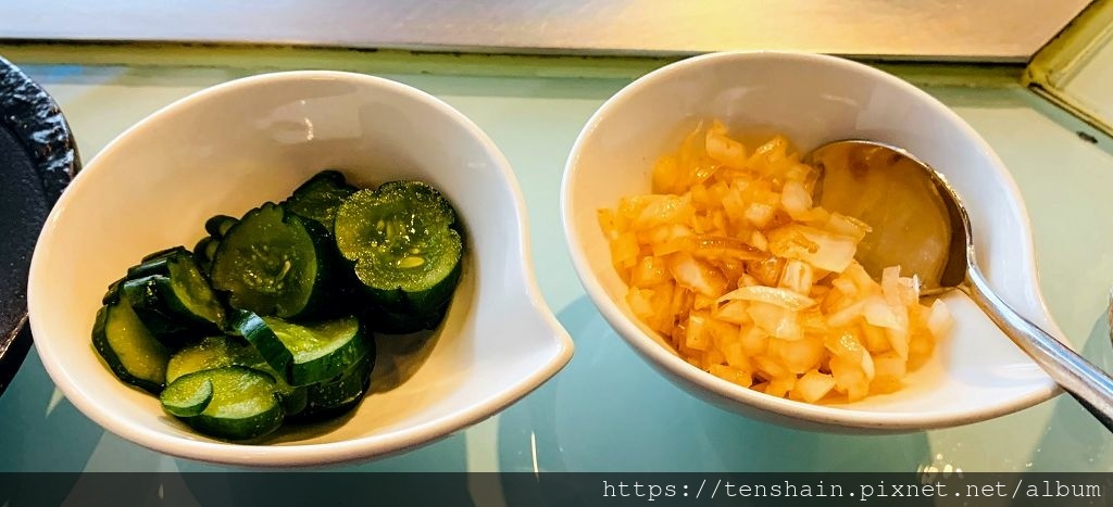 前菜小品是醃漬小黃瓜和洋蔥,別小看這兩樣小菜,外表平平無奇,可是口味卻是出乎意外的清爽開胃。小黃瓜去除了生腥味,只留下清脆的口感,和鮮甜的汁液,還有極細微卻討喜的酸味。醃漬過的洋蔥,沒有了嗆辣,清脆的口感和酸甜的味道非常開胃。漬洋蔥也很適合搭配牛排吃,兩者的甜度都會有加乘的效果。