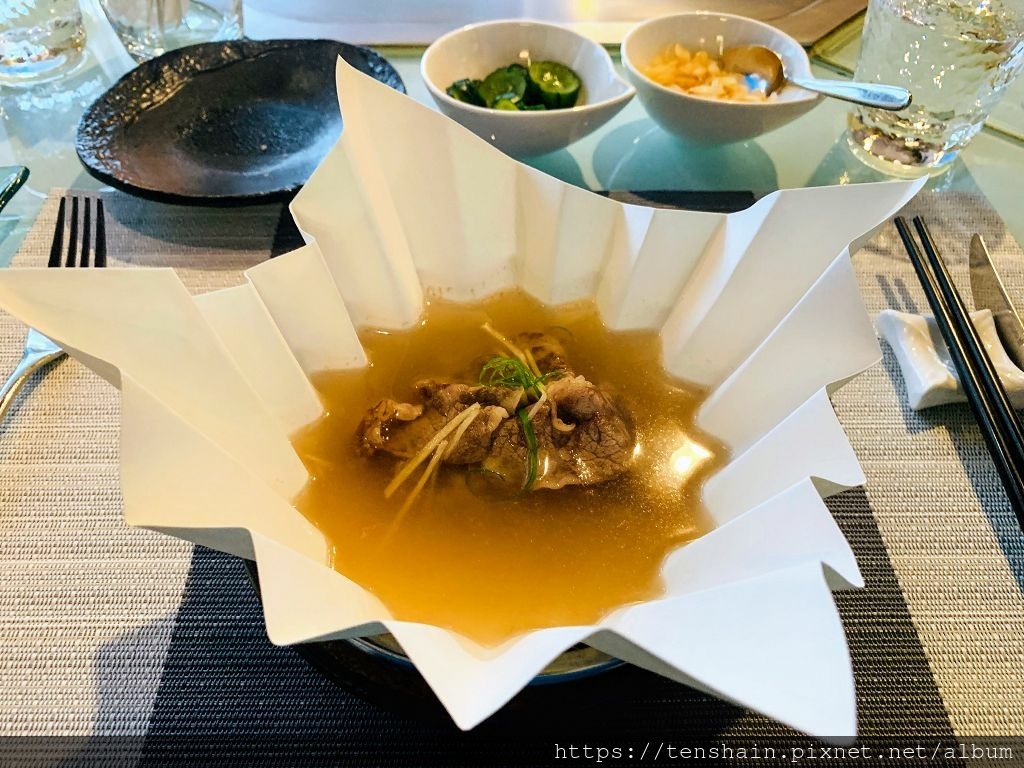 這道「台式牛肉清湯」使用紙火鍋的方式呈現,高級又精緻。紙火鍋用的紙,強度是一般紙的十倍以上,且耐高溫到 220 ℃ 左右,又可以吸收油脂與雜質,維持湯汁的清爽,所以用紙火鍋來盛裝油脂豐富的肋眼牛肉湯,是相當聰明的創意。