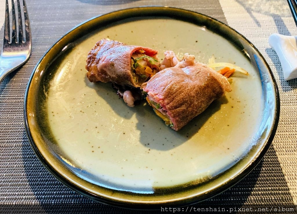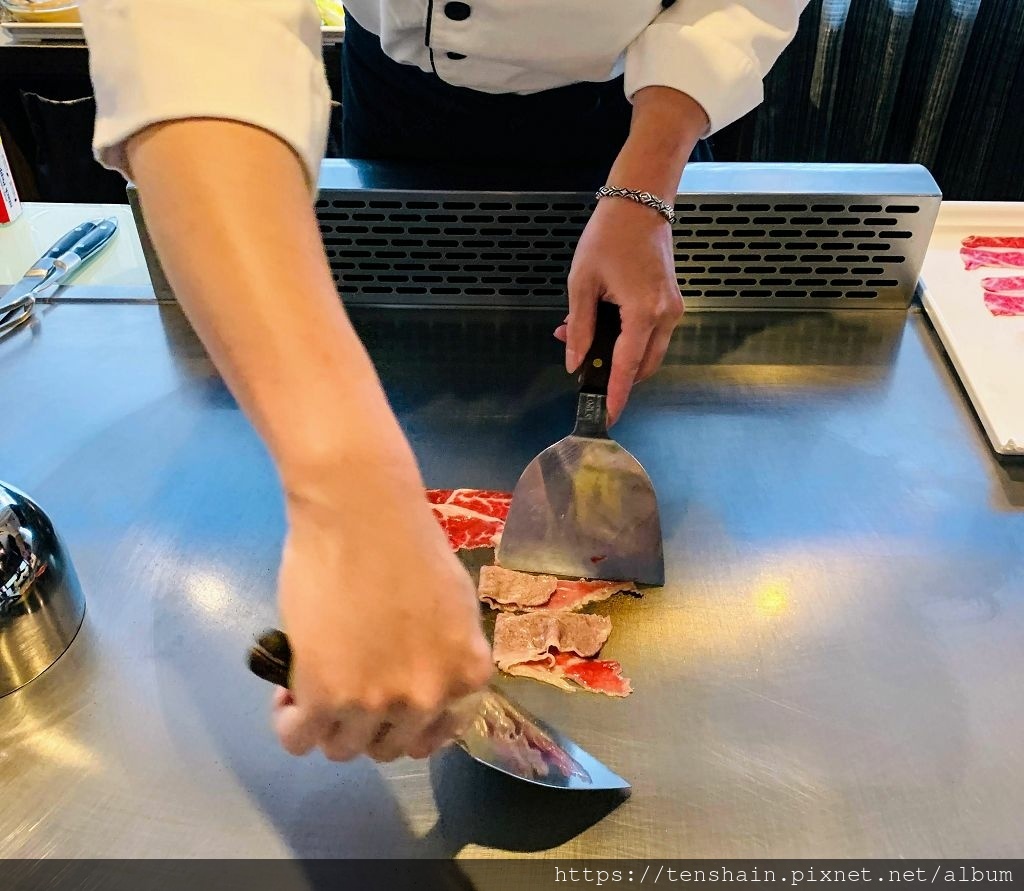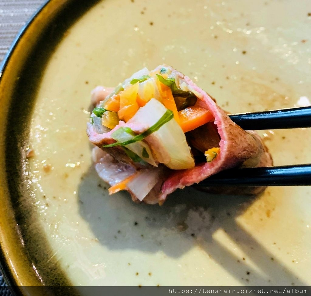 師傅先將美國 USDA Prime 肋眼薄片鋪在鐵板上,放入一片剝皮辣椒,再加入一小撮蔬菜,然後把它捲起來,美國 USDA Prime 肋眼肉捲就完成了。這道菜很考驗師傅的功力,因為動作如果不夠迅速,牛肉會過老,失去了嫩度;包裹肉捲的動作如果不夠熟練,肉捲就容易破損散開,失去了美感。