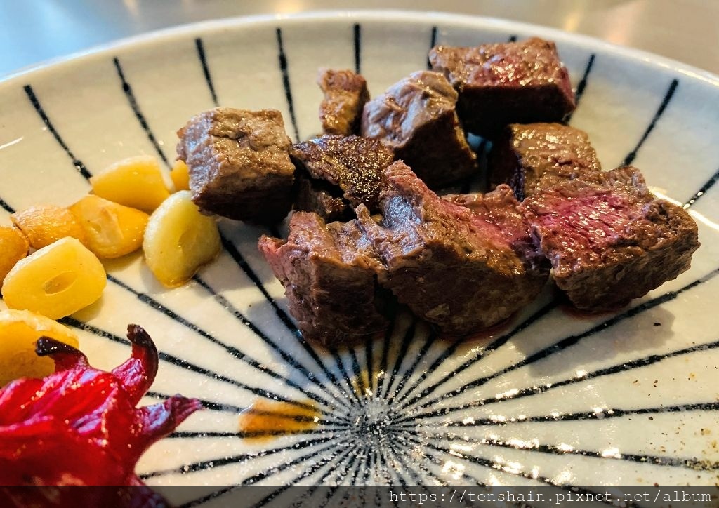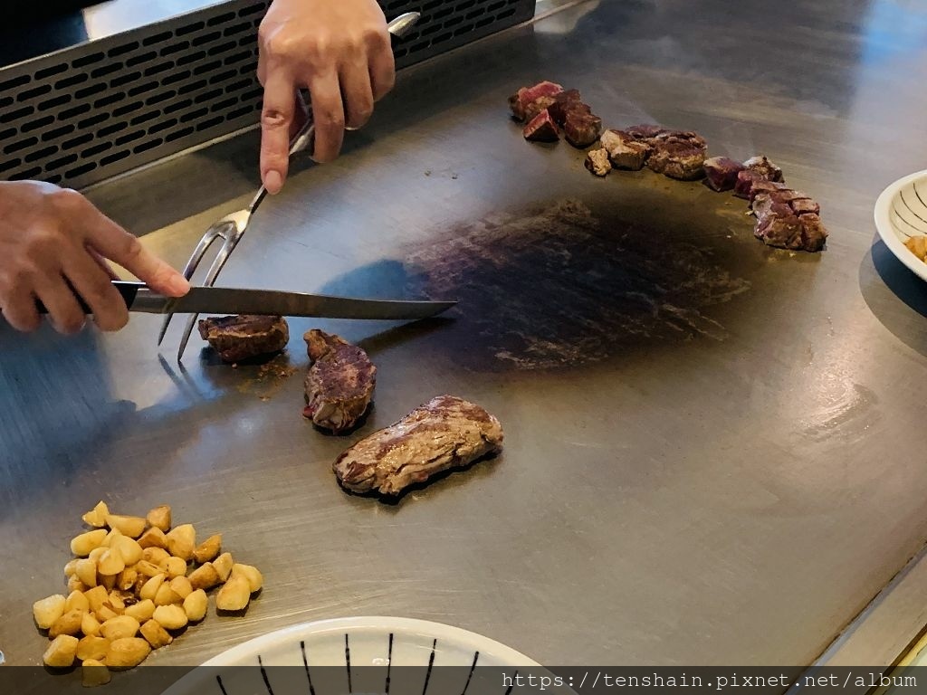 正在鐵板上煎製的是時價一公斤超過兩千元 ( COSTCO 的價格 ) 的美國頂級 USDA Prime 菲力牛排,陣陣的牛肉香氣,引得大家垂涎三尺。到了五分熟,只見師傅輕輕劃過幾刀,一大塊牛排就被分切成適口的大小,有如刀切奶油一般的輕鬆,由此可見美國頂級 USDA Prime 菲力牛排的肉質有多軟嫩!