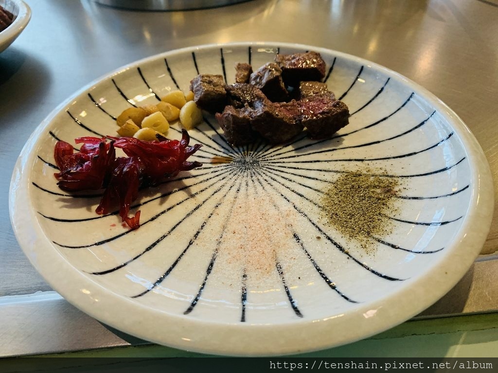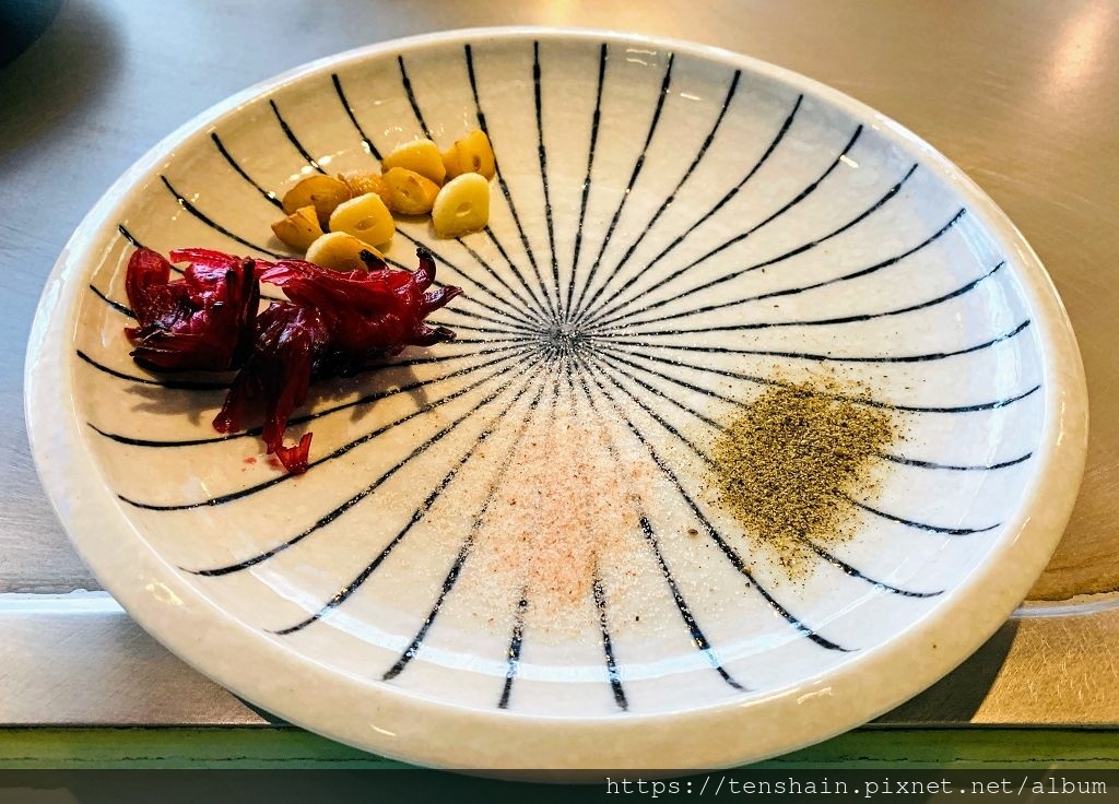 即將進入套餐的高潮,在美國USDA Prime菲力牛排,和美國USDA Prime肋眼肉捲出場前,先把調味沾料和配料準備好:爆香蒜頭、蜜漬洛神花、高山玫瑰鹽、胡椒鹽,任君取用。