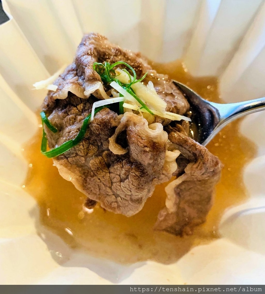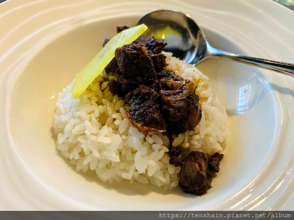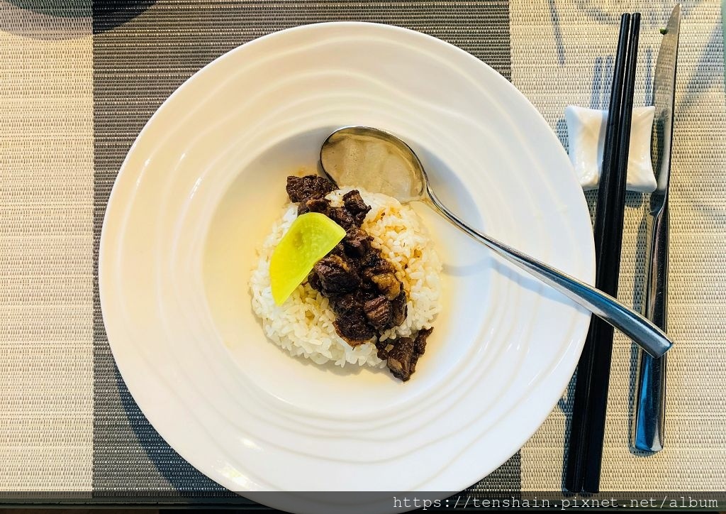 雖然我是道地的台南人,但是我實在沒辦法適應太生的牛肉湯,但是這個「台式牛肉清湯」,我可以。恰到好處的熟度,保留了肋眼牛肉的嫩度,搭配薑絲牛肉湯,清爽的口感和牛肉的芳香,可以說是台南牛肉湯的高級版,我喜歡!
