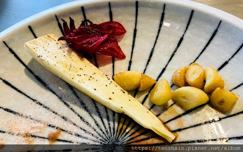 再來一塊茭白筍。我覺得鐵板燒料理很神奇的一點,就是不管什麼食材,經過高溫的鐵板一煎,味道立刻升級一大階。就像這塊茭白筍,師傅只是簡單灑點鹽和黑胡椒,煎了幾分鐘,就香氣四溢、脆甜無比。