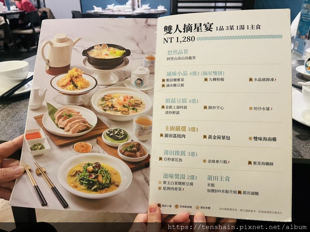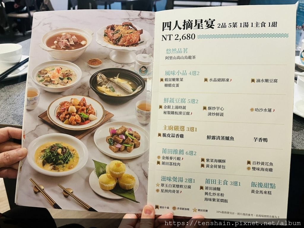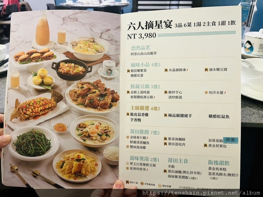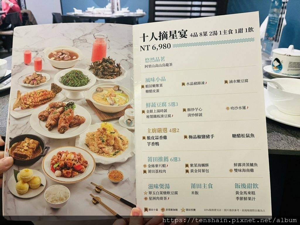 還有十人摘星宴,6980 元,有 4 品、8 菜、1 湯、1 主食、1 甜點、1 甜飲。摘星宴菜單,老婆和大女兒看了看,總覺不甚合意,決定自己點菜。