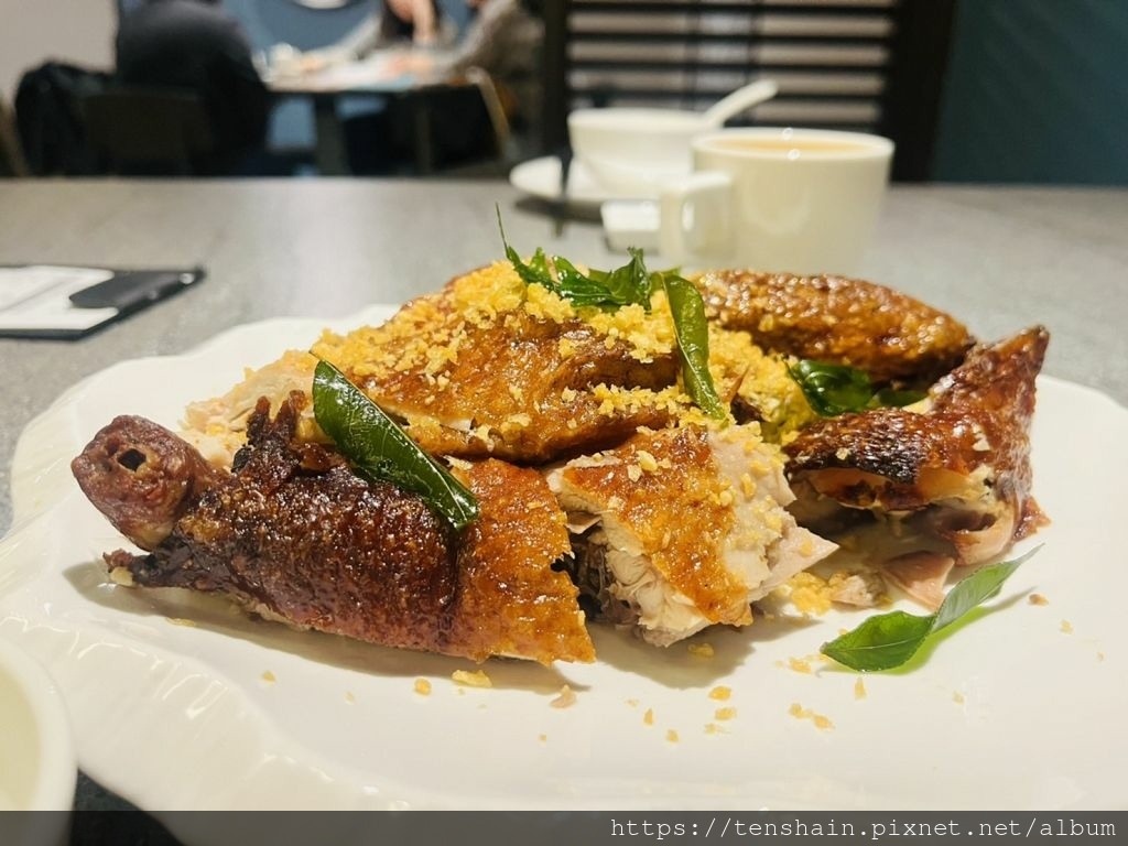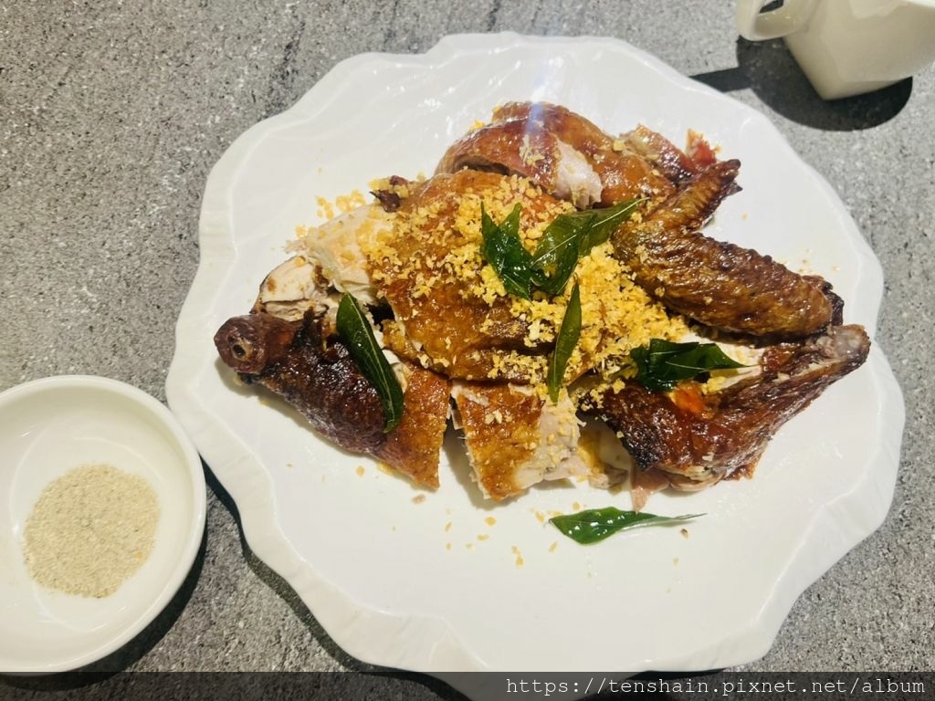 嚴選肉質鮮嫩的黑羽土雞,歷經九道繁複工序--醃漬、汆燙、冷藏、風乾及高溫油炸等技法才出爐。肉質香甜緊實,而且富含鮮美肉汁,帶著九層塔和蒜酥香氣的味道非常迷人。
