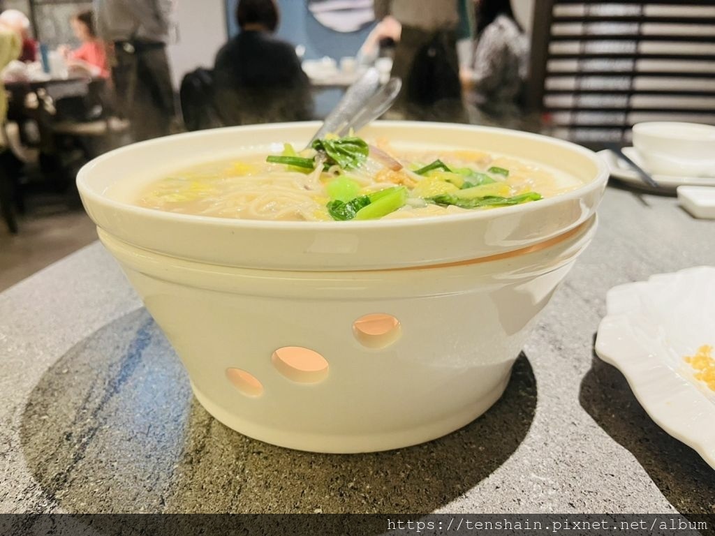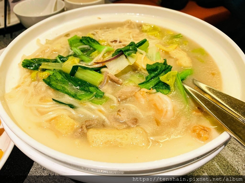 一入口便能感受到湯頭的濃郁鮮甜,上下嘴唇都有點沾黏在一起的感覺,膠質滿滿。吸滿湯汁的麵條,爛中帶 Q ,非常好吃。配料以海鮮為主,和湯汁、麵條在口中交織出絕妙滋味,令人回味無窮。這道菜我真的大推!沒吃過之前,絕對想像不到有這麼美味的麵條,這麼鮮的湯!