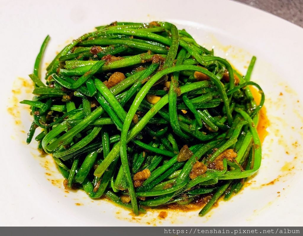 「叻沙水蓮」,將翠綠水蓮,用東南亞特有的叻沙醬大火快炒,讓每一根水蓮都裹滿叻沙醬,卻仍保有青翠的顏色。