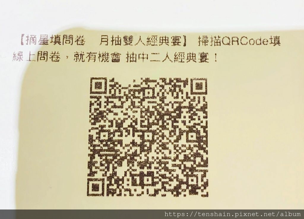 服務生最後一次來收盤子的時候,順便遞給我們一張紙,原來是掃瞄紙上的 QRCODE ,上網填用餐問券,就可以參加抽獎活動。