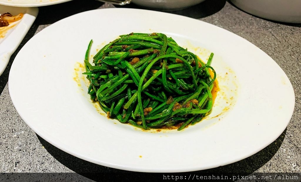 這道菜在菜單上的辣度和「金絲麥片蝦」列在同一等級,事實嚐起來卻辣上許多,不嗜辣者要慎選。水蓮獨特的清脆口感好吃,但辣度真的讓我們吃得有點艱難,因為我們三人都不太敢吃辣。