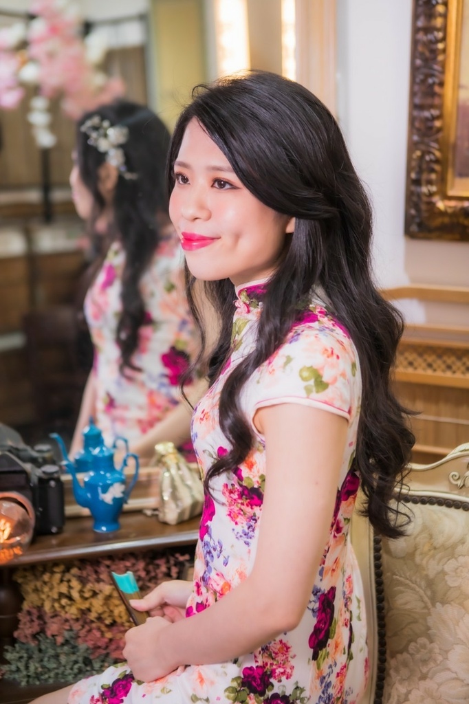 彩妝師會因為服裝來化適合攝影的攝影妝,我其實選的是緊身短旗袍,本來想要選擇穿黑絲襪,但攝影師覺得旗袍不適合黑絲襪,後來選了大波浪捲髮,光是化妝美髮就要花上1個半小時!