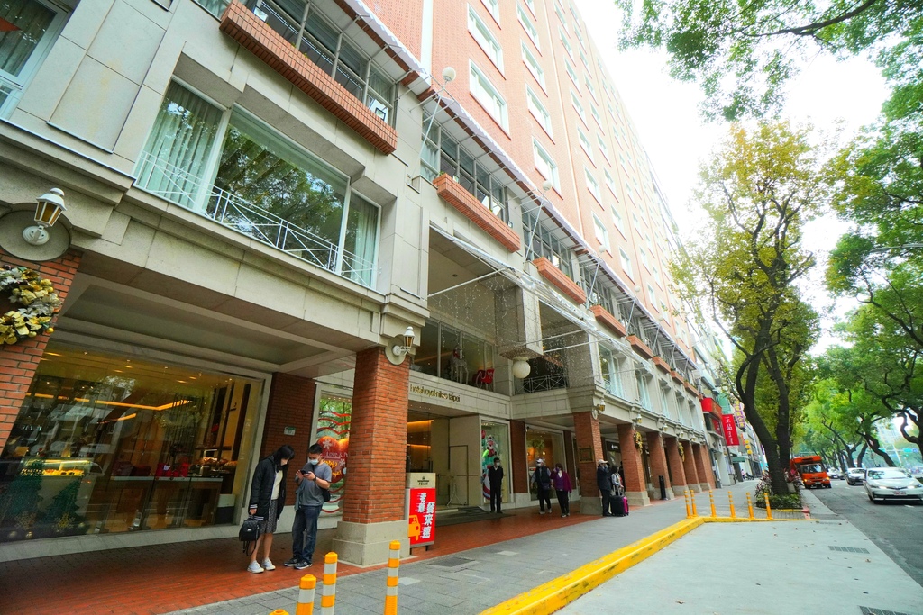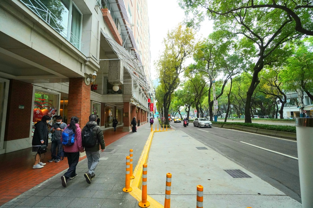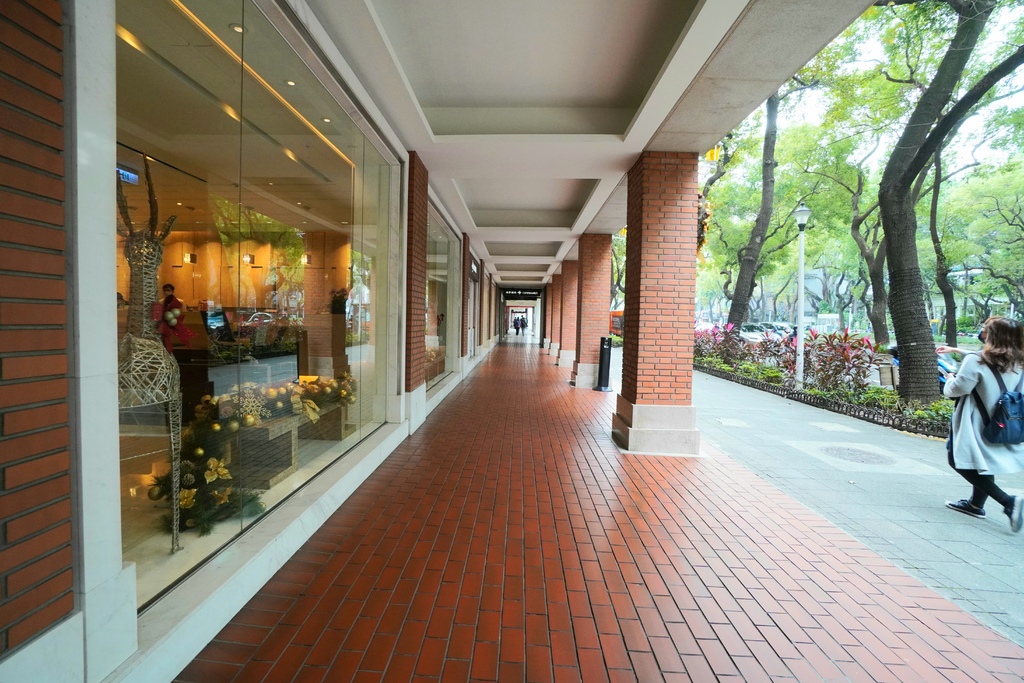 台北老爺大酒店與馬路間有著大大的人行道跟自己的廊道所以退的離馬路有段距離這真的是超棒的,傍晚或是吃完早餐在這兒散步走走真的很舒服的。