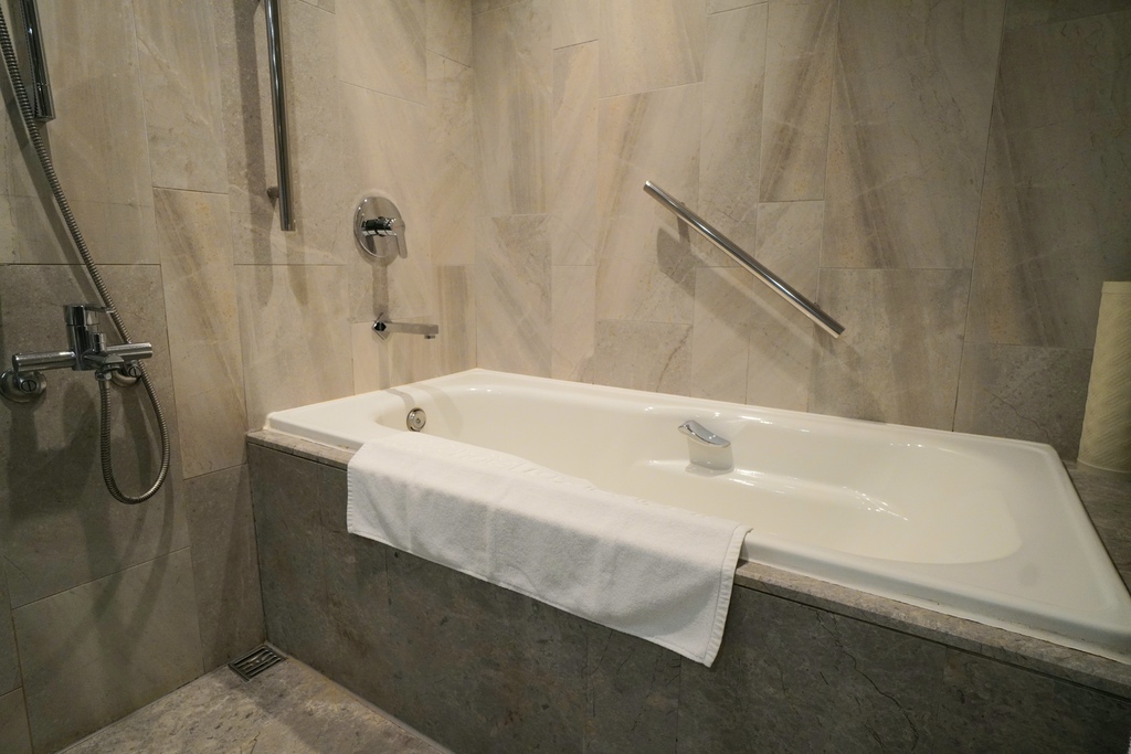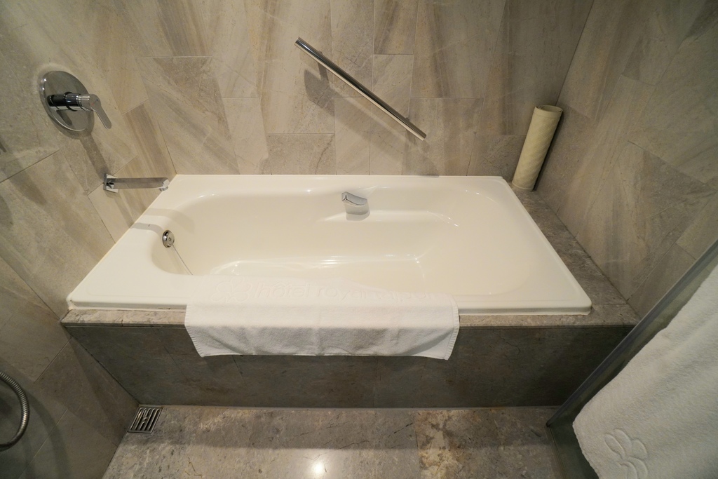 台北老爺大酒店的浴缸Size也是整個人可以躺進去泡的,小金175cm身高也是可以在裡頭伸展的很舒服。