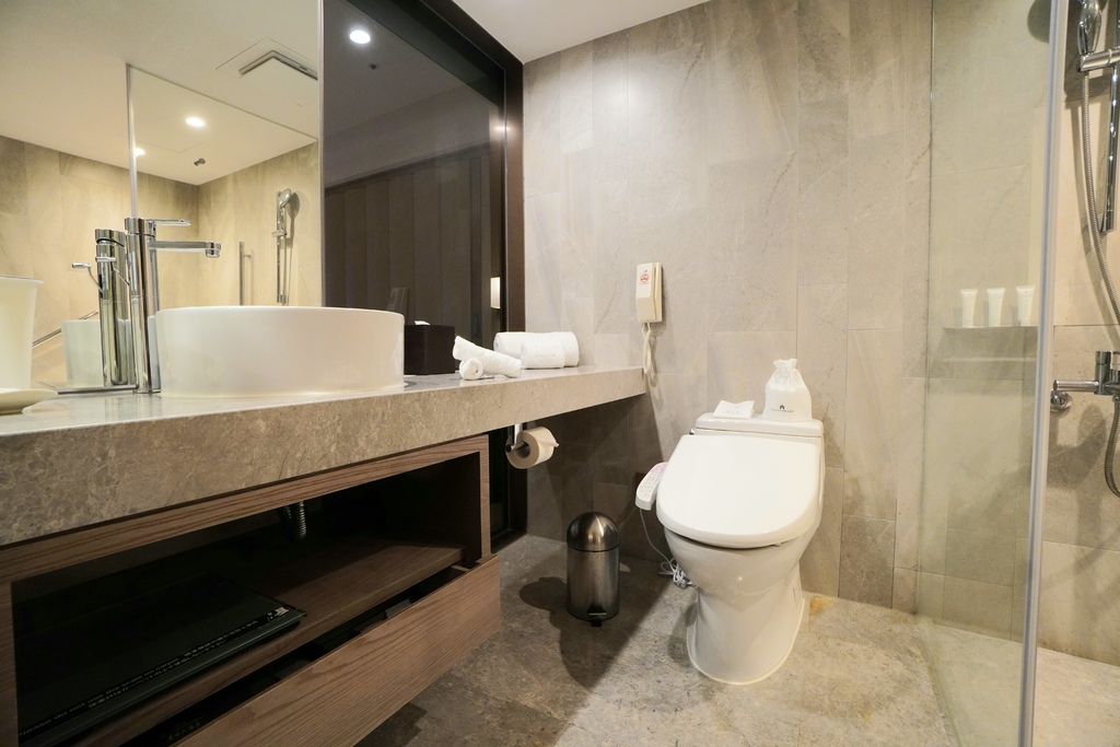 台北老爺大酒店的浴室也是很寬敞的,馬桶跟洗手台在一個空間,淋浴跟浴缸在一個空間所以不用擔心會把地板弄的濕濕的,小金喜歡淋浴跟浴缸是在一塊兒的這樣方便的多。