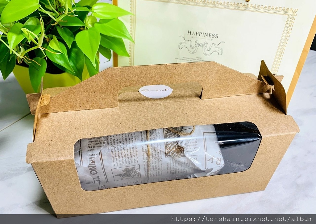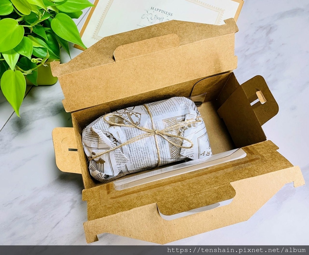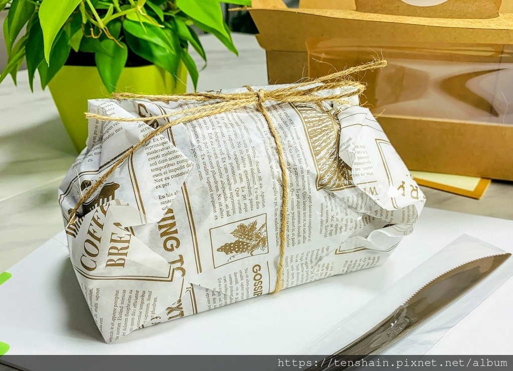 除了有強韌的外盒保護,因為磅蛋糕的奶油含量相當豐富,所以蛋糕外層以防油紙包裹,再以棉繩捆綁,細節做得相當到位。