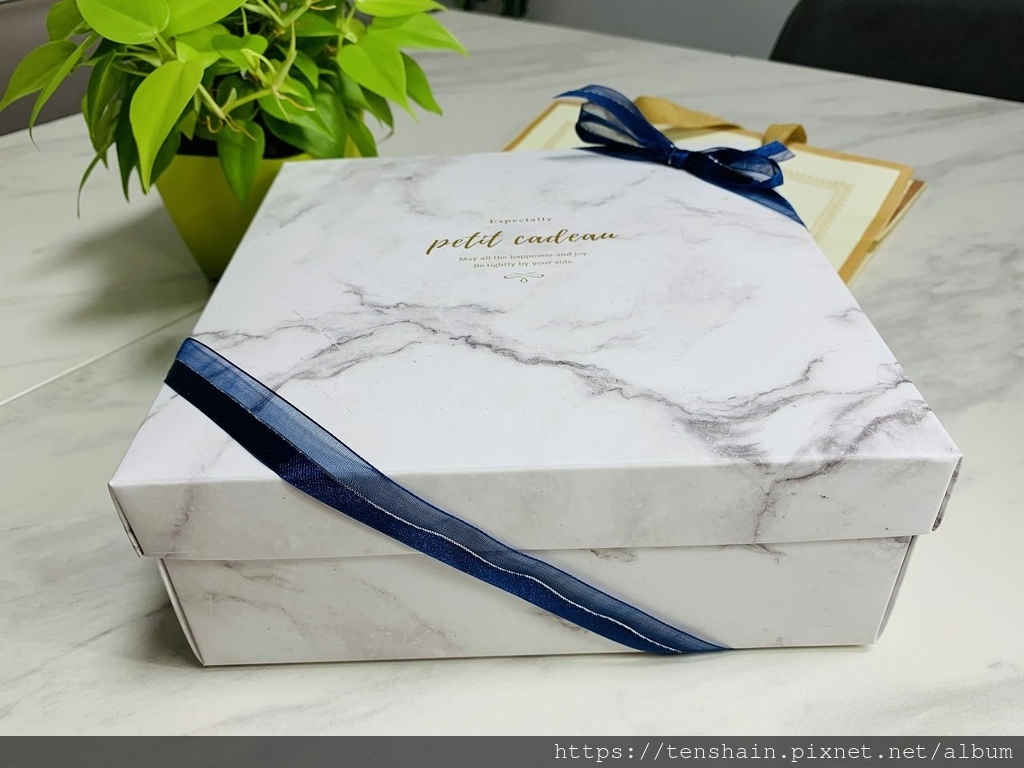 磅蛋糕我們吃過很多,但是接下來要開箱的"伯爵茶巴斯克蛋糕",倒是第一次吃。"伯爵茶巴斯克蛋糕"顯然比較像貴婦在吃的下午茶,所以用典雅的大理石紋紙盒包裝,再以藍絲帶繫縛,最後打個漂亮的蝴蝶結收尾。整體包裝,比起"蘭姆無花果磅蛋糕"華麗許多。