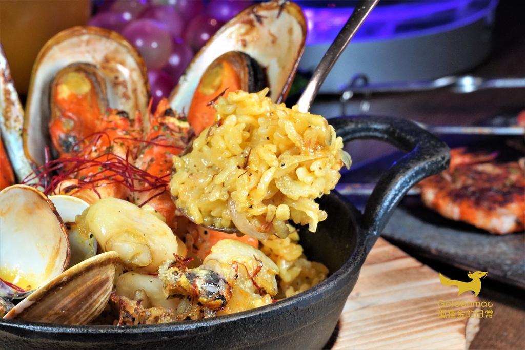 跟著海鮮一起燉煮的還有舖在底下的米飯~吸滿了香濃的醬汁跟鮮美的海鮮湯汁~每一口都非常誘人,這小金真的可以自己嗑掉一整份耶!!