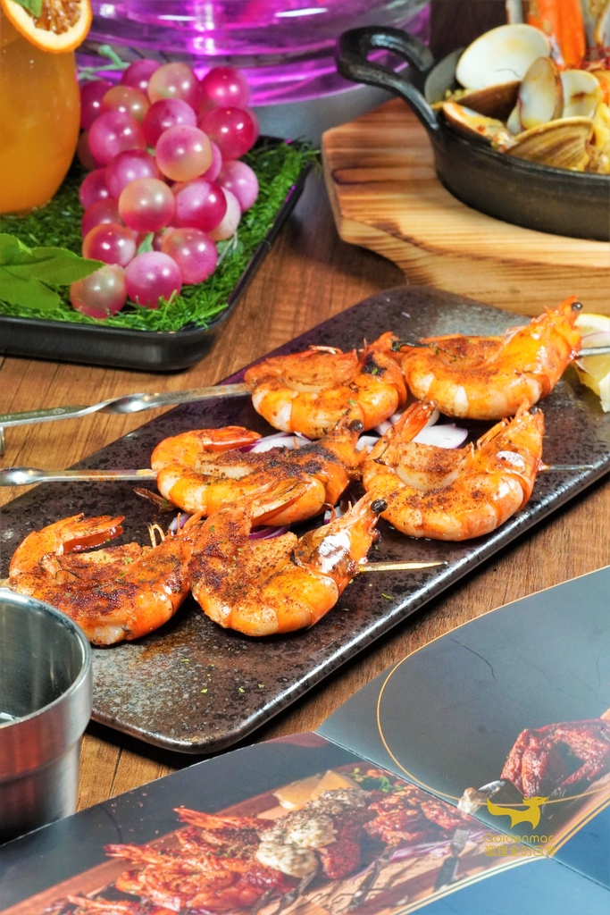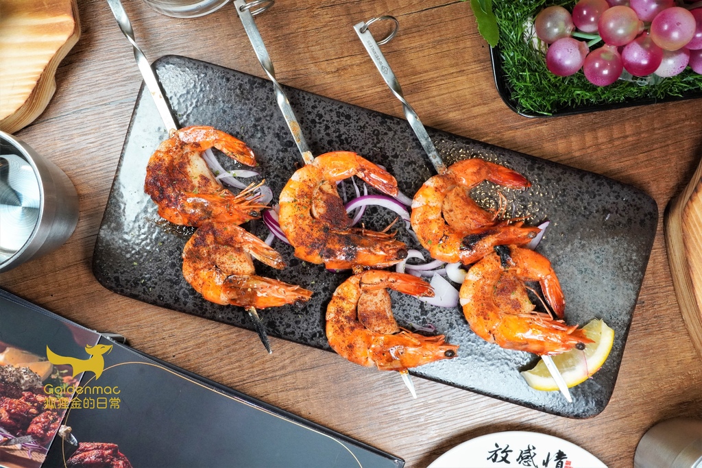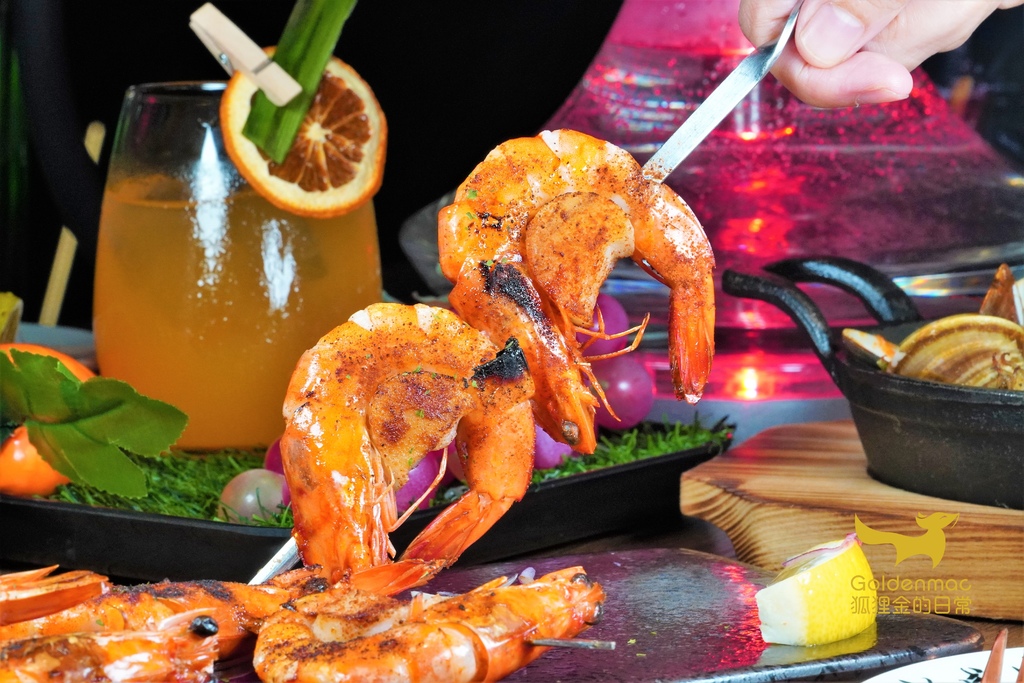 烤過的鮮蝦本身蝦殼釋放出來的香氣就很迷人了,大家仔細看一下在每隻蝦子中間還特別串上了干貝,大部份的蝦殼在料理前也都幫大家剝好了~大口跟著干貝一起咬下真的太享受了。