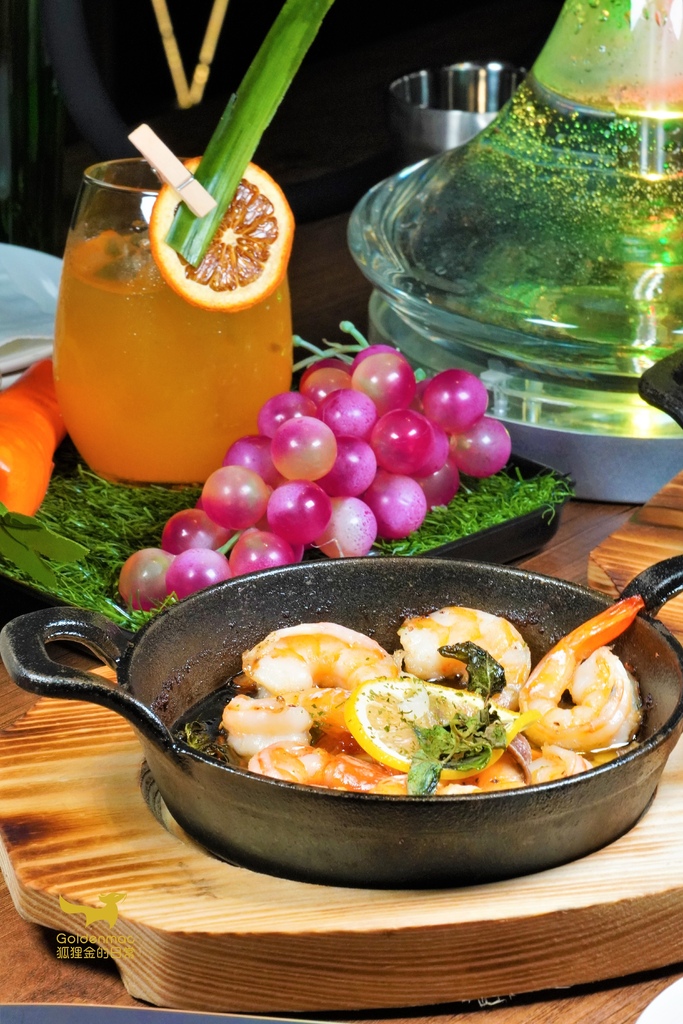 主廚用橄欖油加入大量的大蒜、香料爆出香氣,再將去殼的鮮蝦加入快炒,火侯掌控的很剛好蝦子本身的Q彈脆口感都保有,而且泥腸也處理乾淨了可以直接吃~裡頭加入的檸檬帶著酸香的滋味,真的是下酒必備啊!
