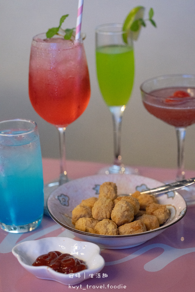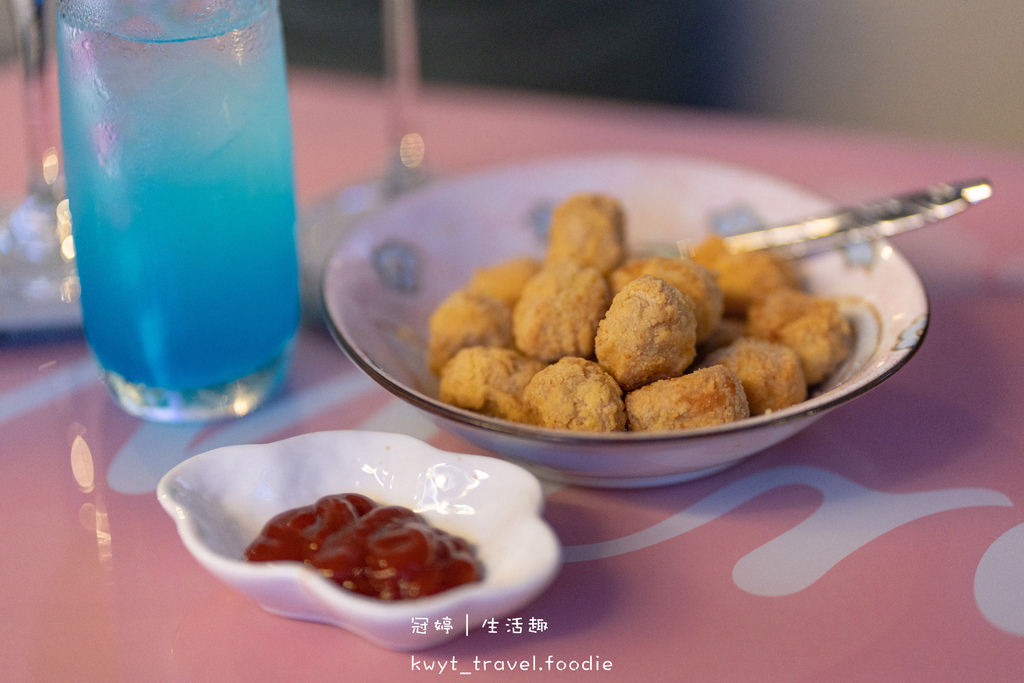 餐點都是現點現炸的,大約需等候15分鐘的製作時間,雞球一上桌飄散在空氣中的香氣實在太迷人,外酥內多汁的鹹香雞球很適合搭配調酒一起享用。